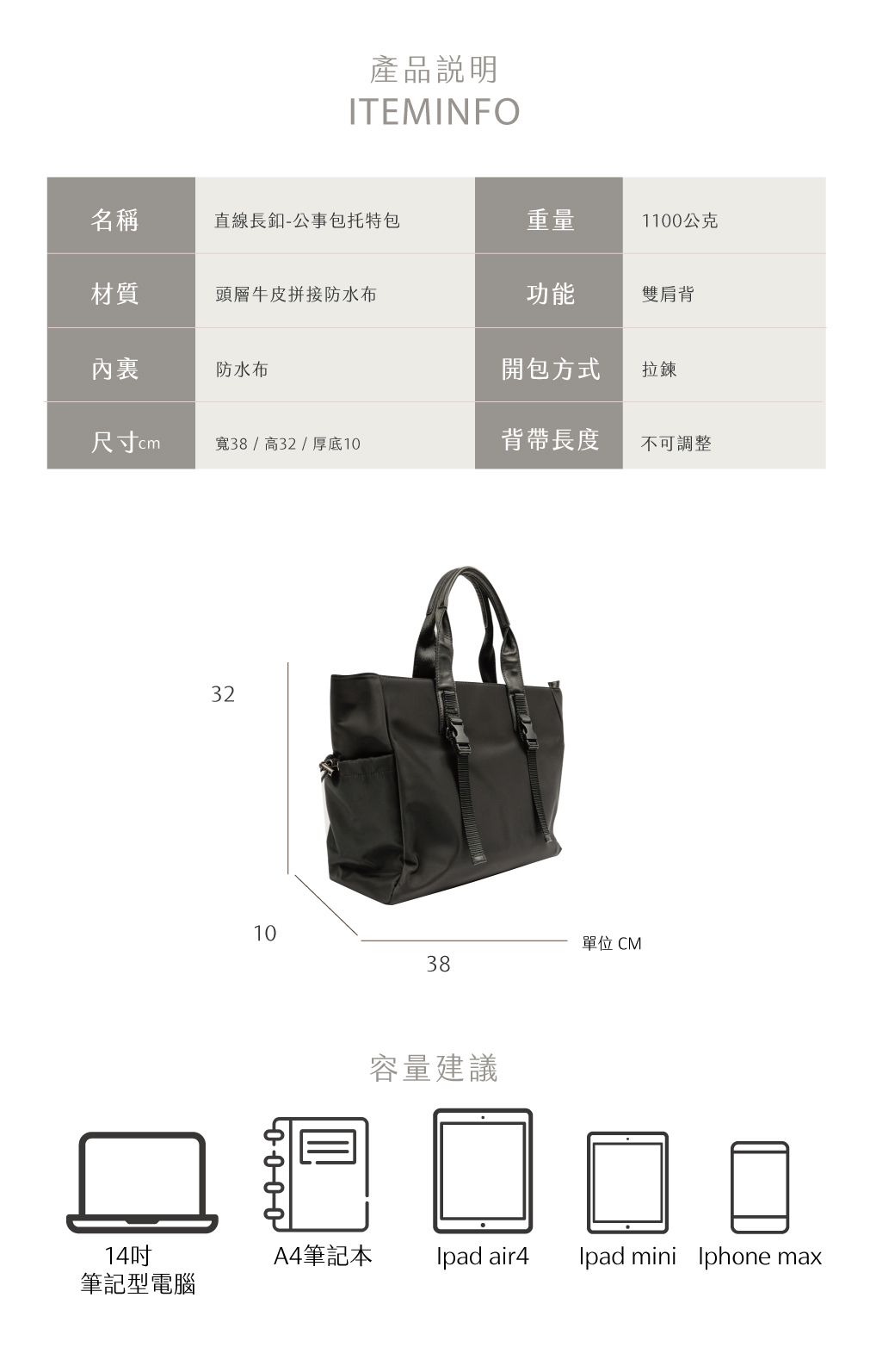 建議容量:書本/14吋筆電/摺疊傘