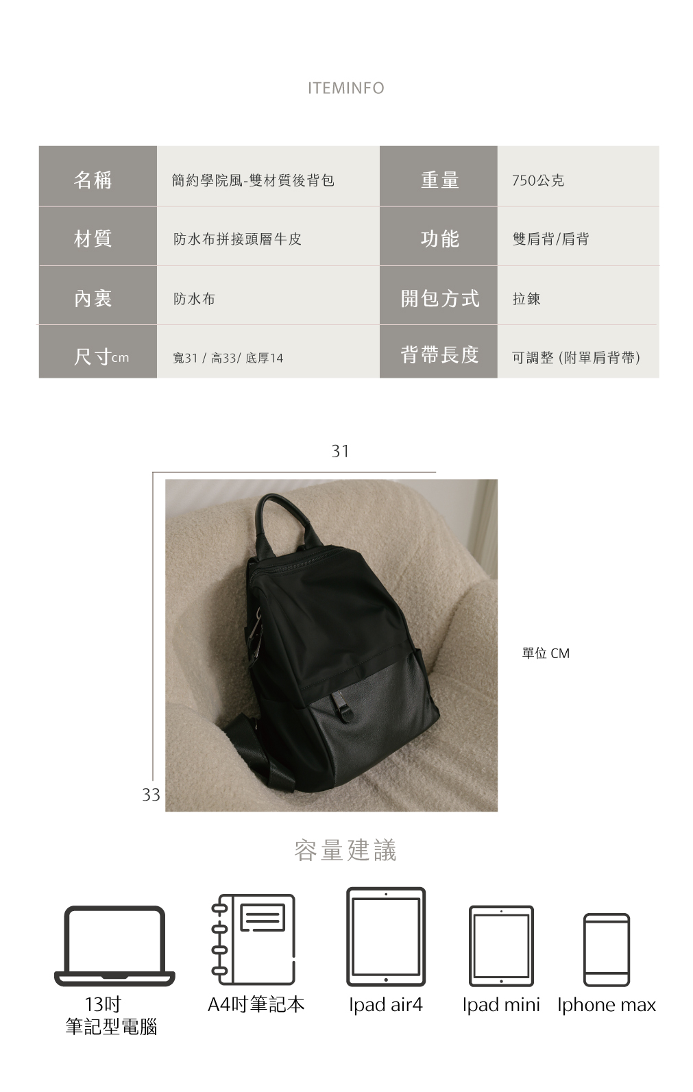 建議容量:書本/13吋筆電/摺疊傘