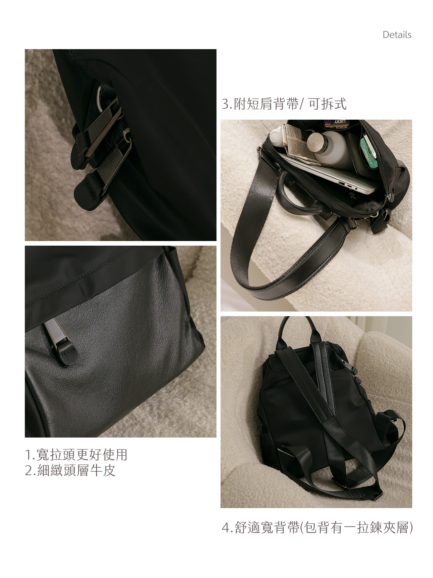 背帶:不可拆,可調整長度後背帶 附可拆短背帶