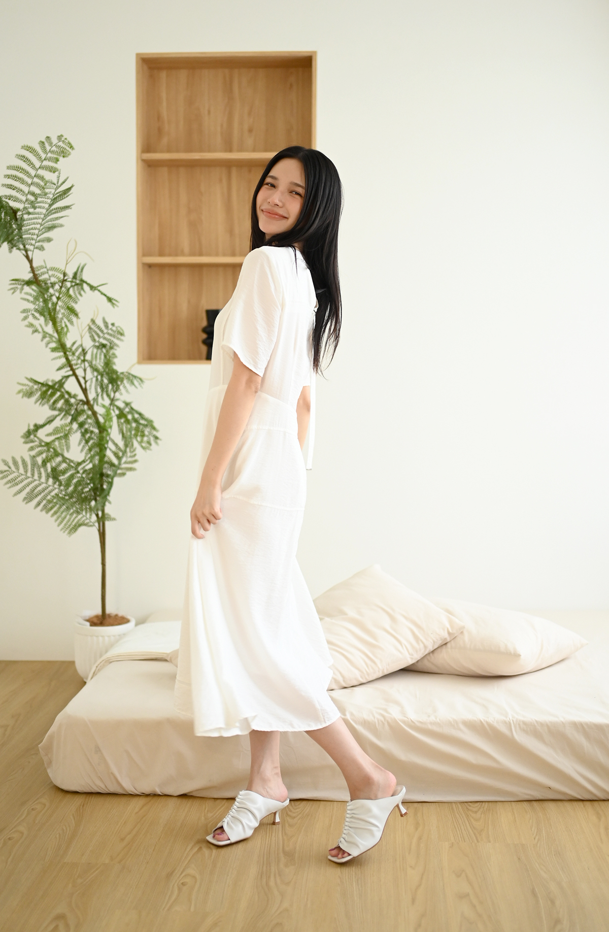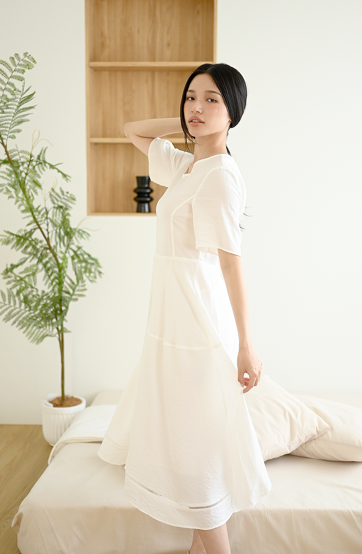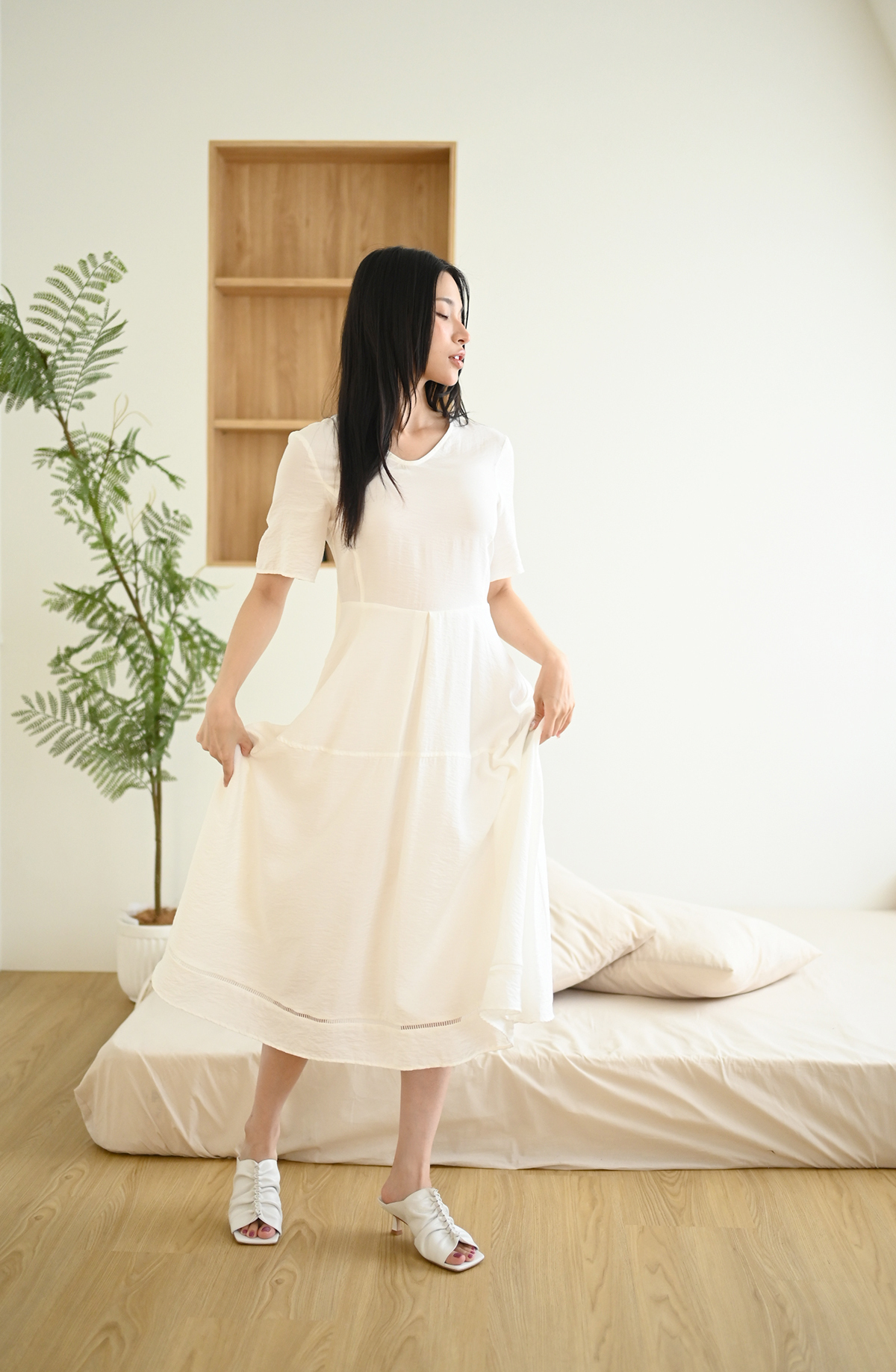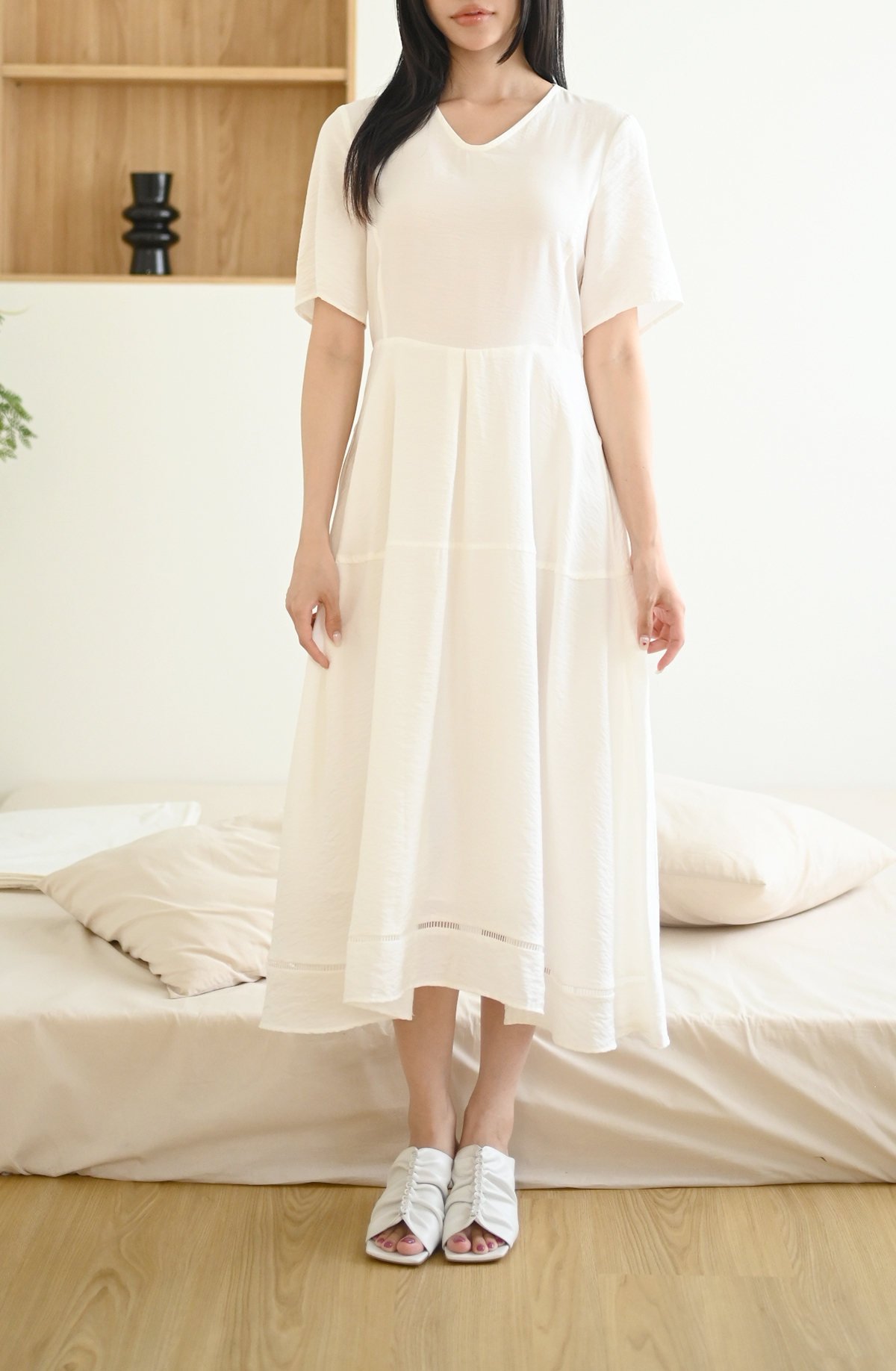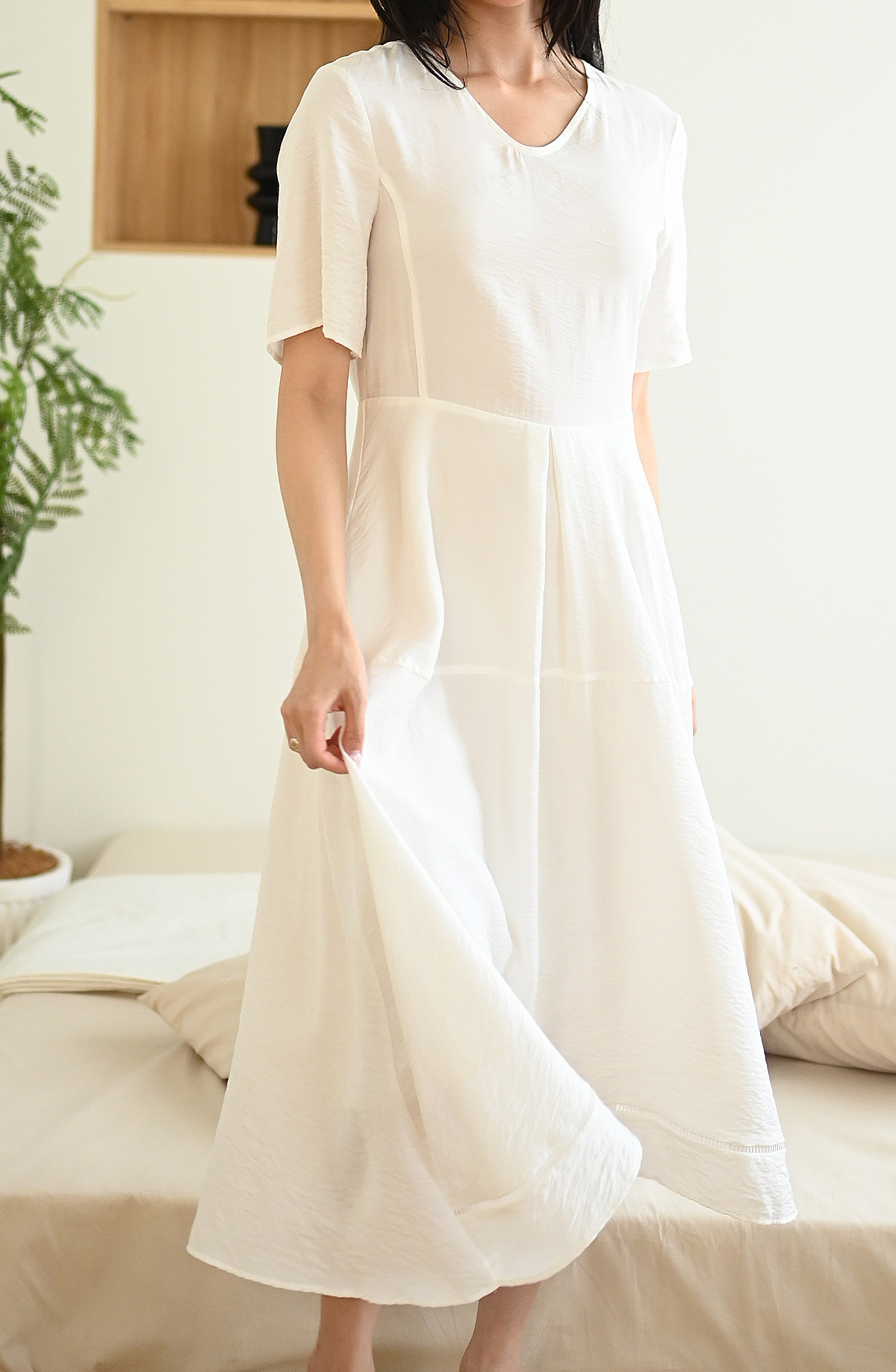 素面拼接-飄逸短袖洋裝