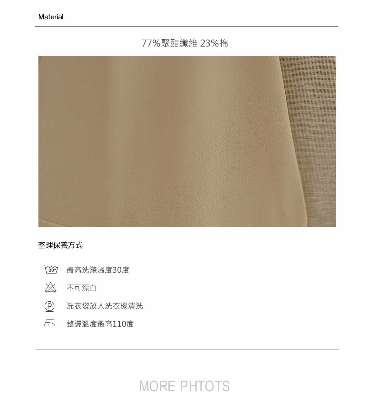 |尺寸和面料|下方有圖表說明 衣物保養方式