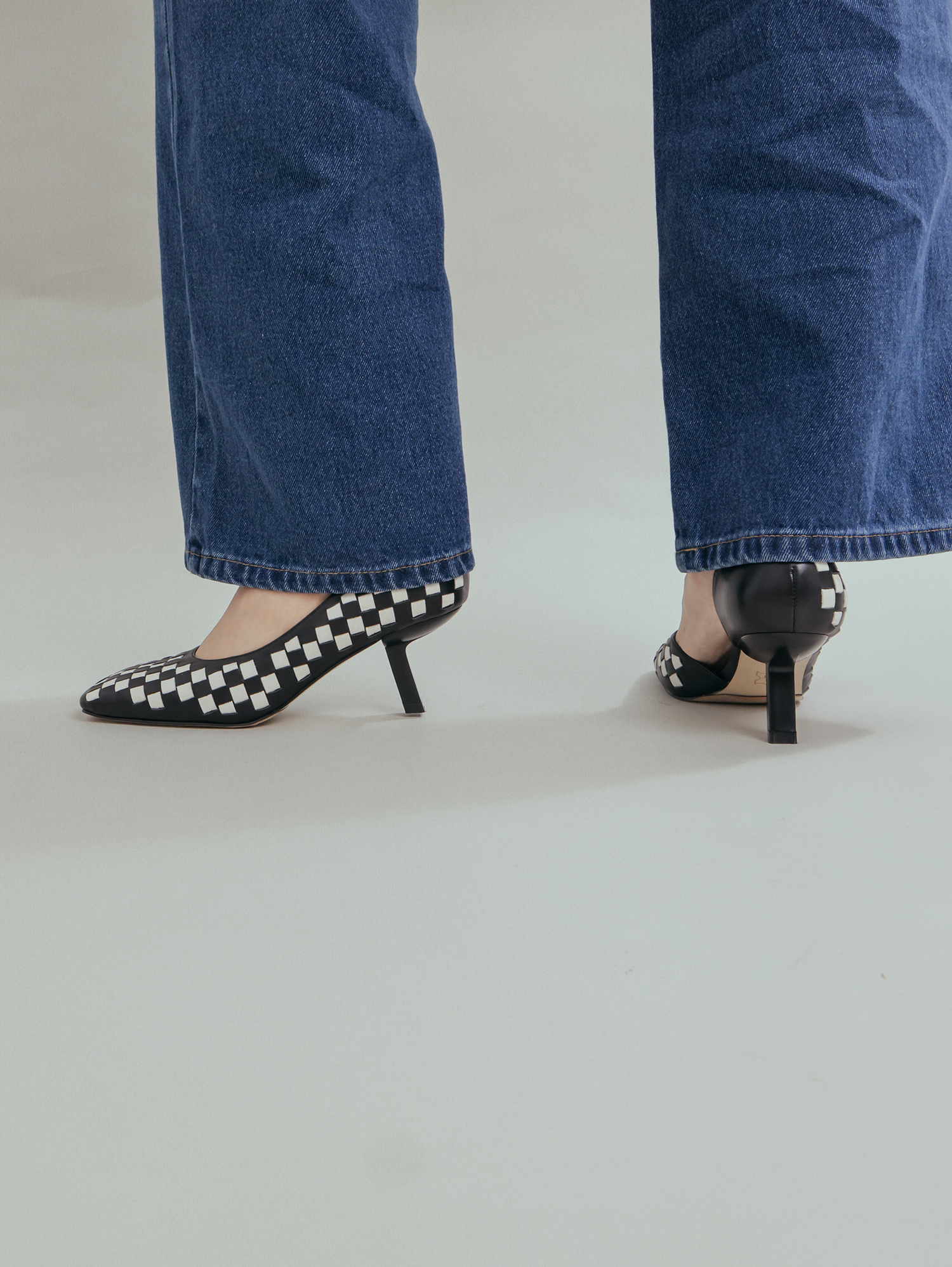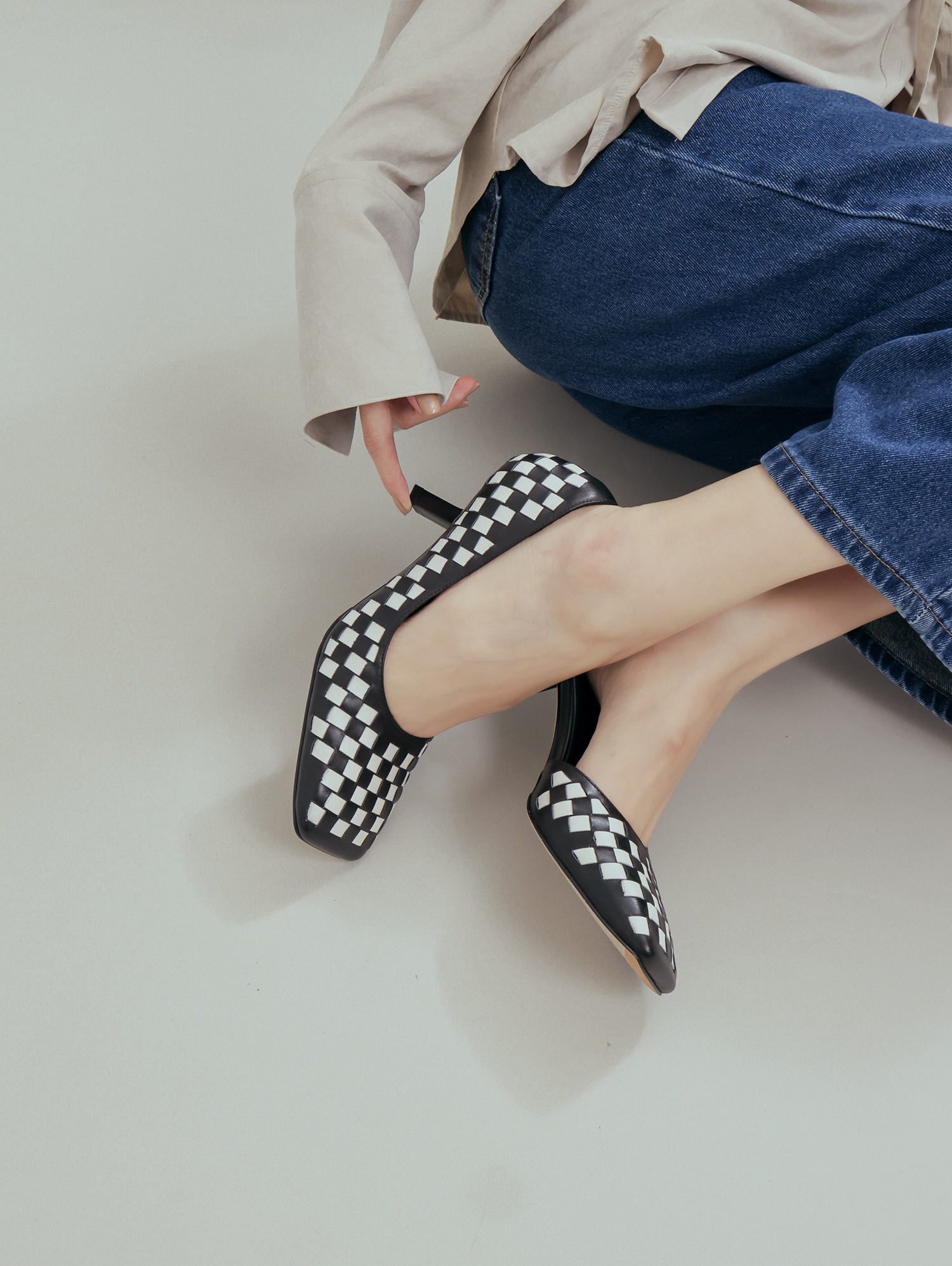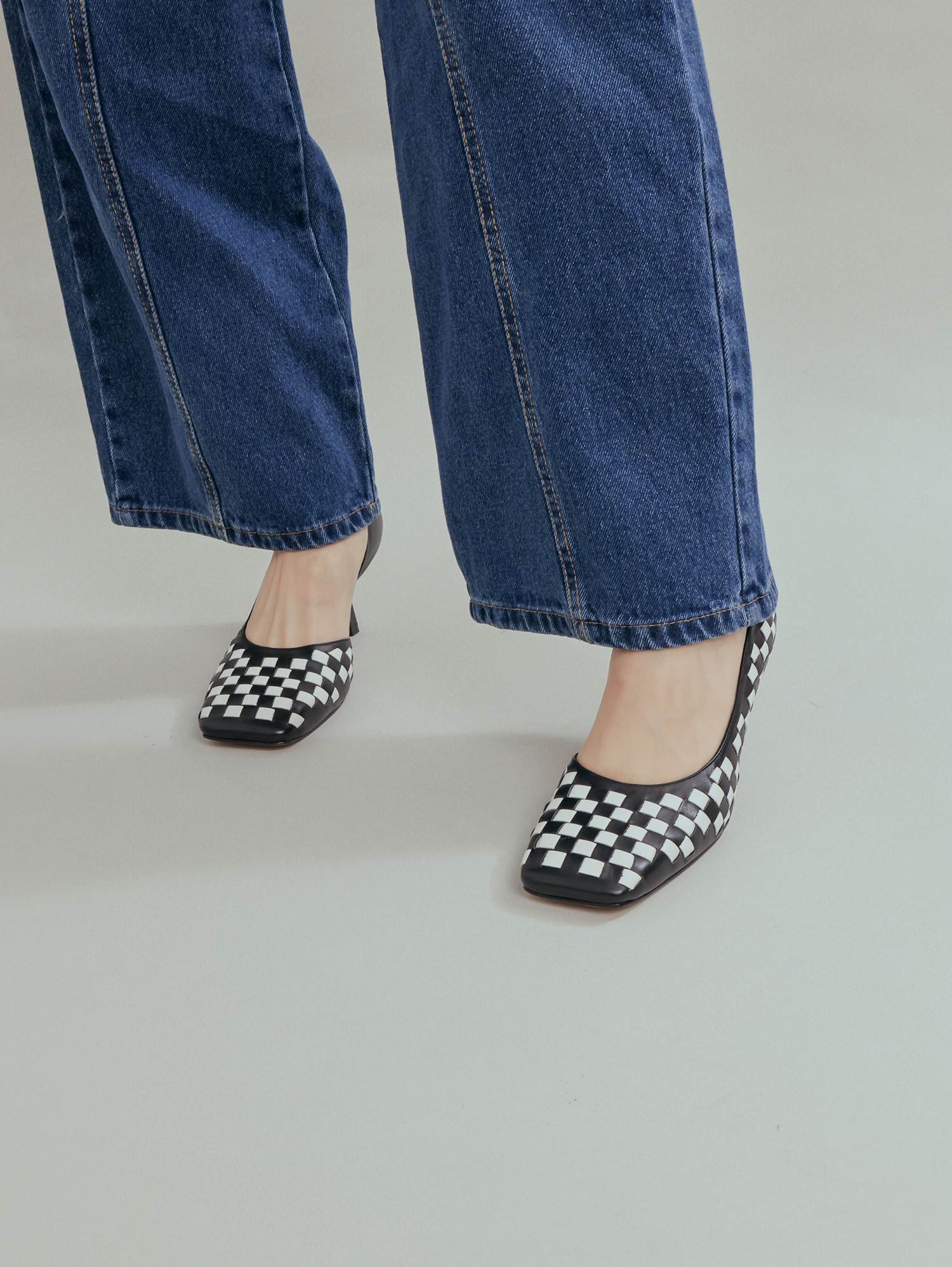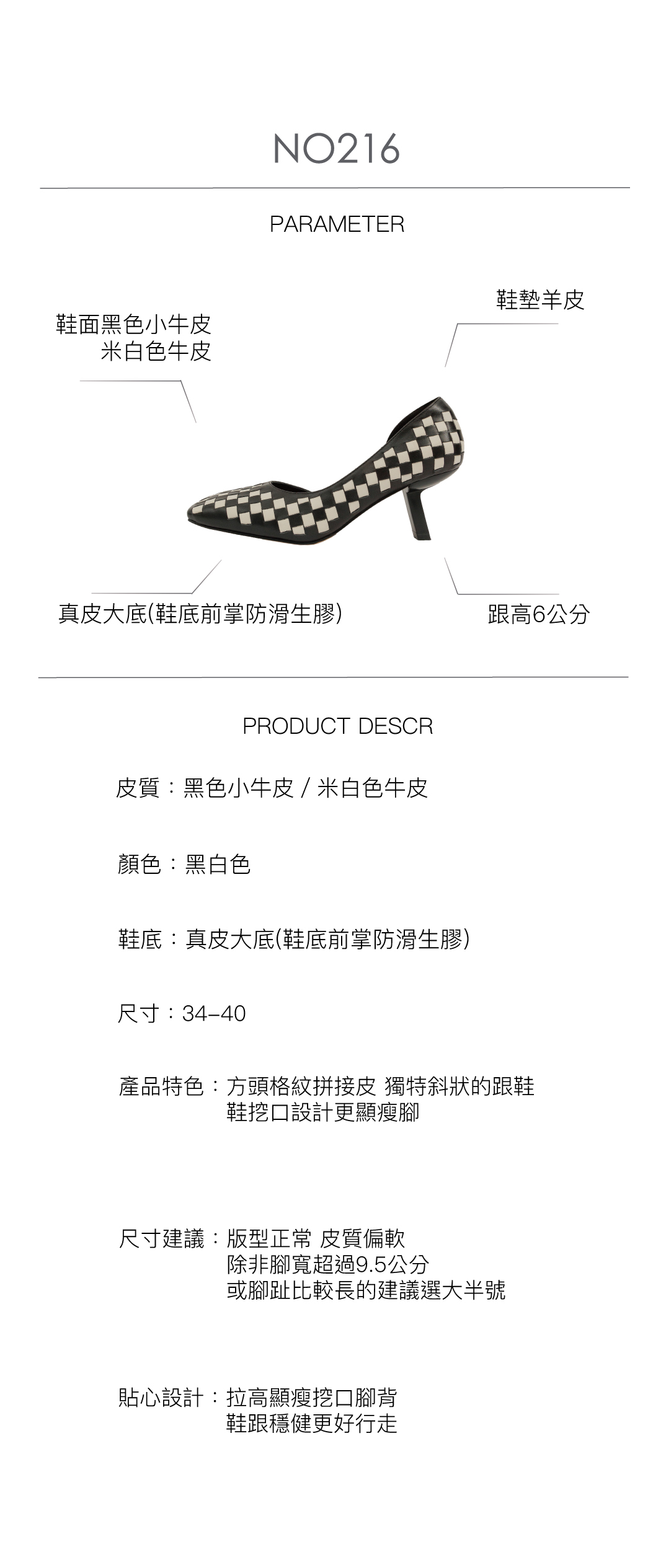 方頭格紋拼接皮 獨特斜狀的跟鞋