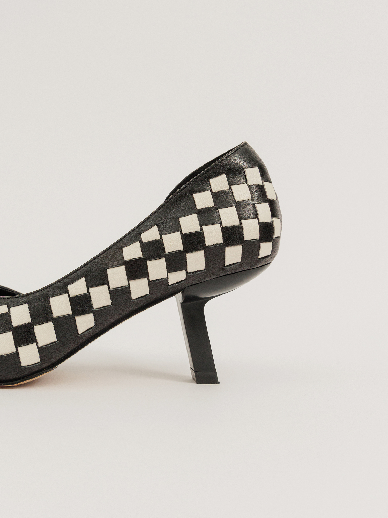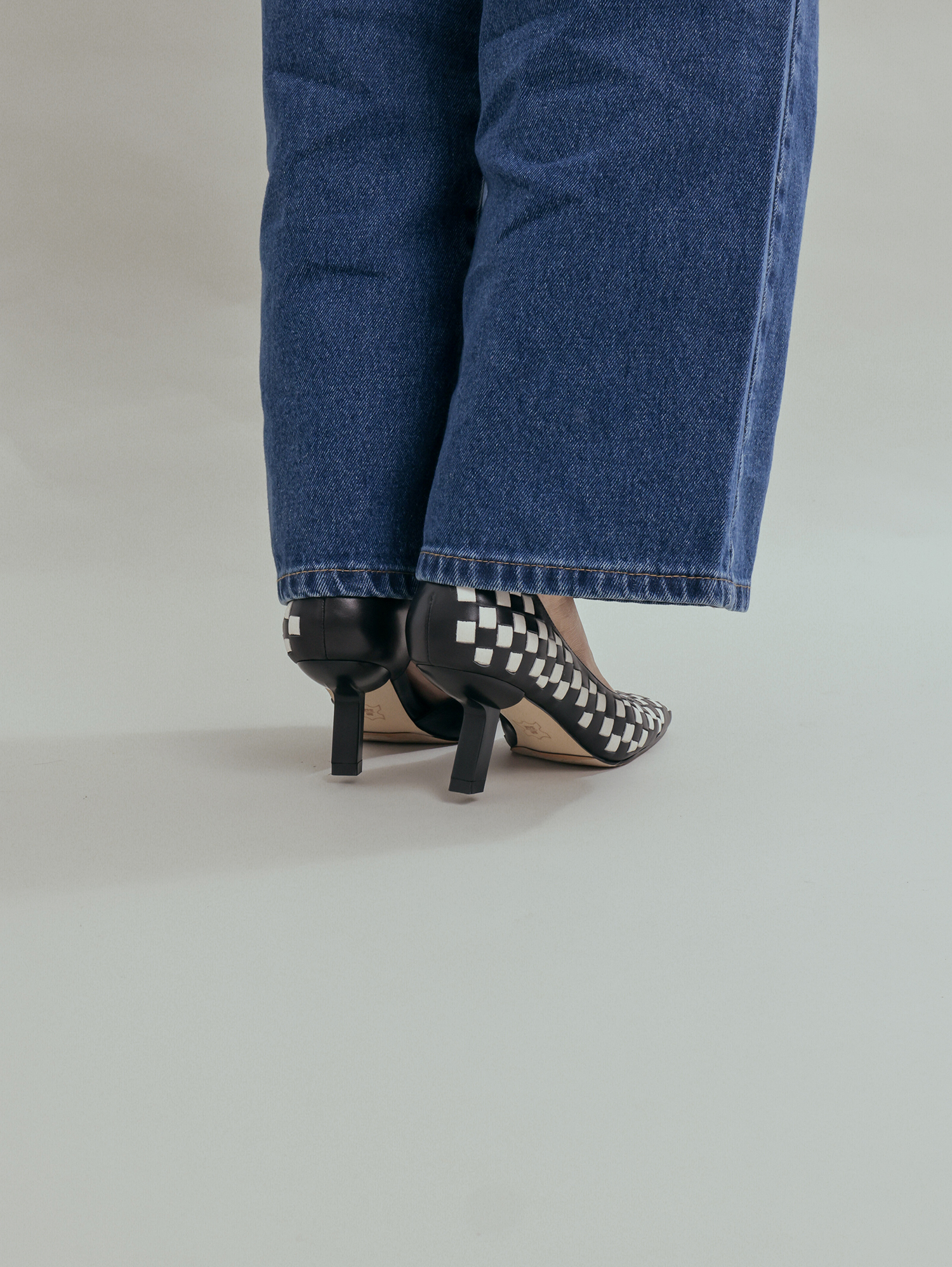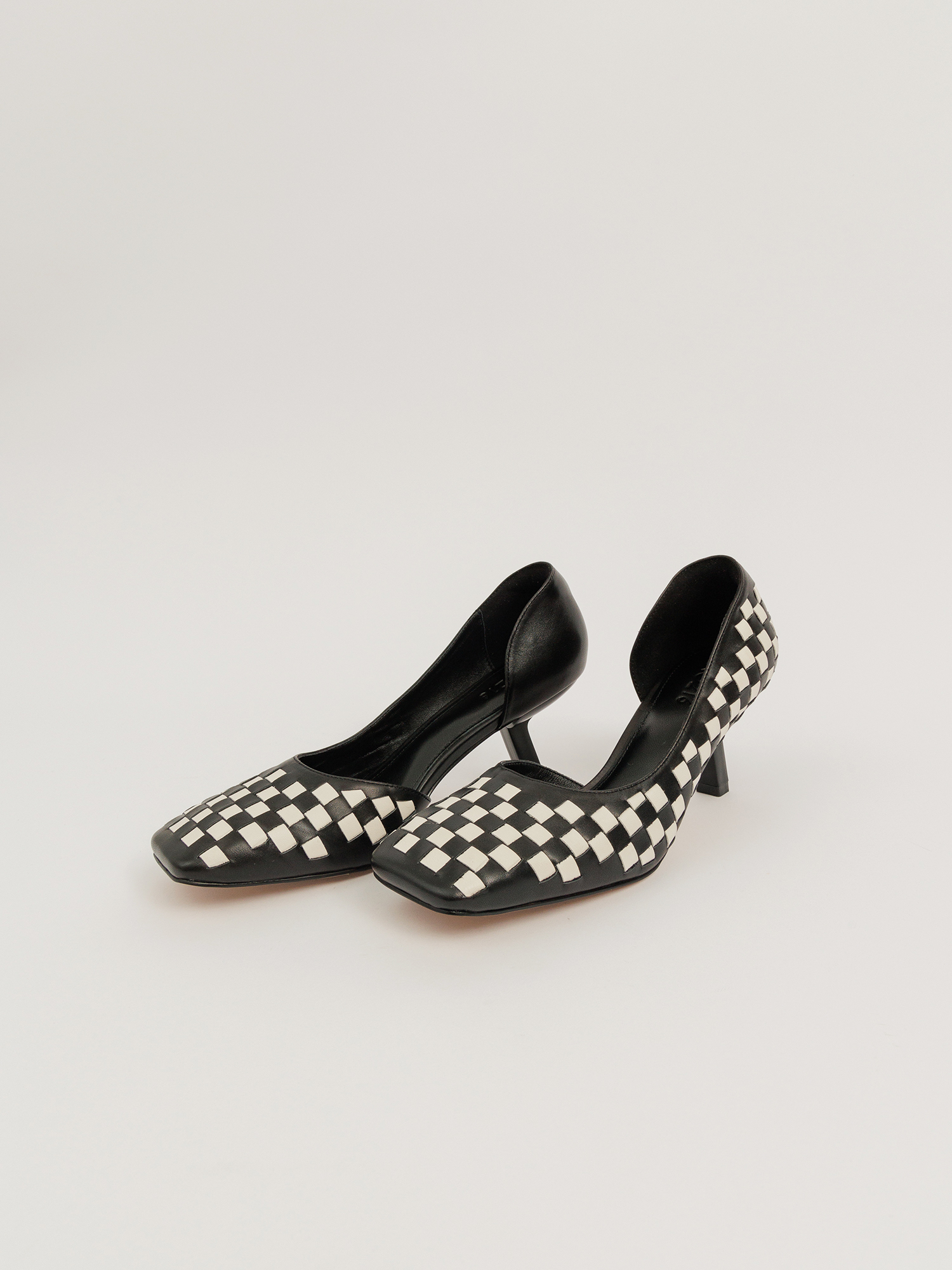 方頭格紋拼接皮 獨特斜狀的跟鞋