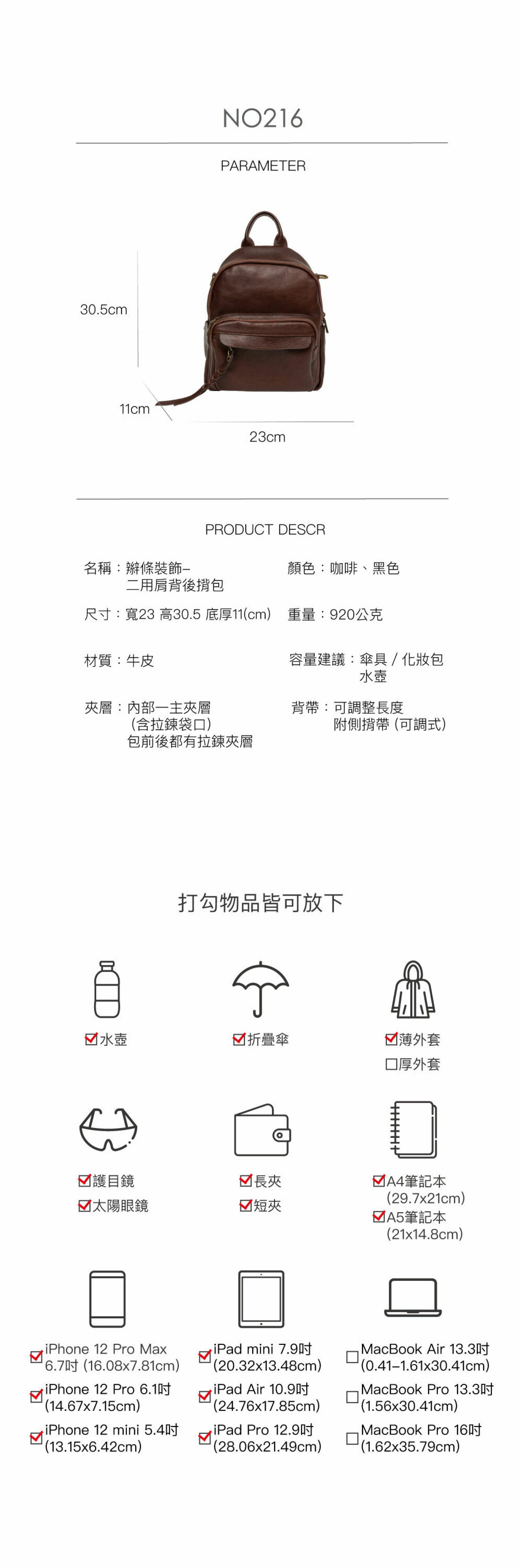 夾層:內部一主夾層 ( 含拉鍊袋口) 包前後都有拉鍊夾層