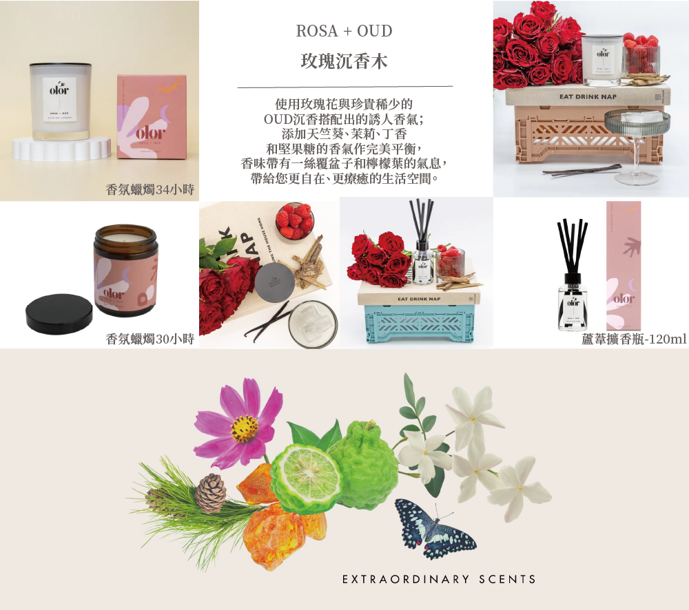 使用玫瑰花與珍貴稀少的OUD沉香搭配出的誘人香氣;添加天竺葵、茉莉、丁香和堅果糖的香氣作完美平衡,香味帶有一絲覆盆子和檸檬葉的氣息,帶給您更自在、更療癒的生活空間。