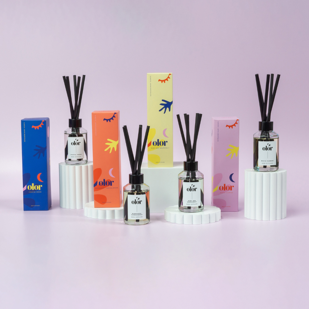 OLOR 採用 LED 透明玻璃瓶搭配五支扎實黑色纖維蘆葦,打造現代、簡約和時尚風格。