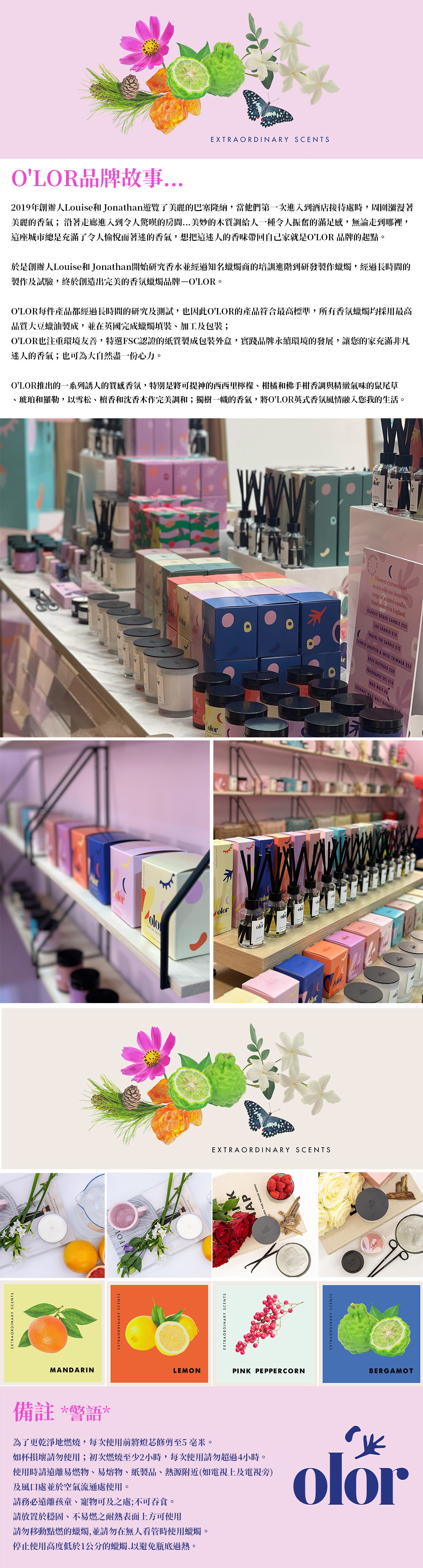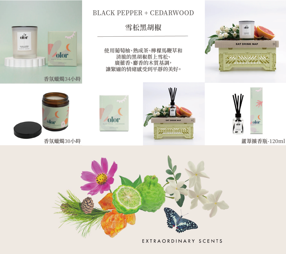 使用葡萄柚、熟成茶、檸檬馬鞭草和清脆的黑胡椒搭上雪松、廣藿香、麝香的木質基調,讓緊繃的情緒感受到平靜的美好。