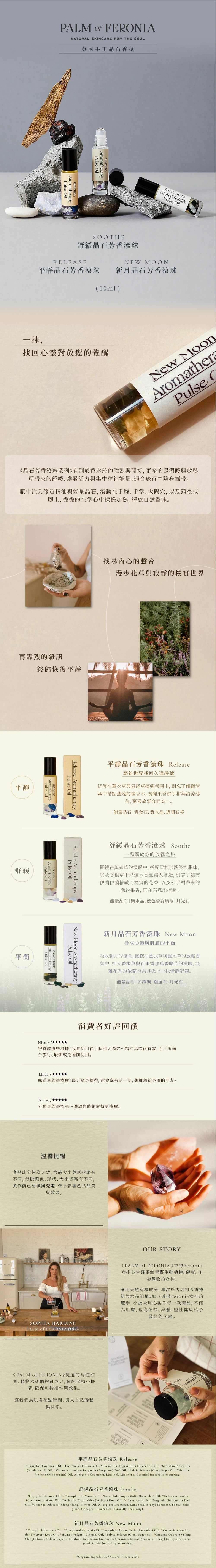 PALM of FERONIA 選用天然有機成分,專注於古老的芳香療法與水晶能量。小批量用心製作每一款商品,不僅為肌膚,也為情緒、身體、靈性健康給予最好的照顧。
