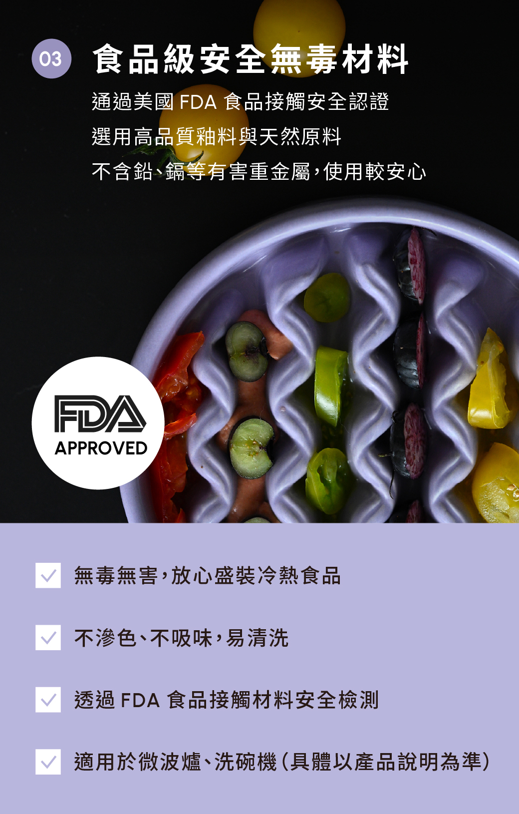 結合餐食愉悅與健康,鼓勵緩慢進食,陶瓷材質易清潔且安全,更提供可選木質架高底座,改善進食方式,全面考慮舒適和健康體驗