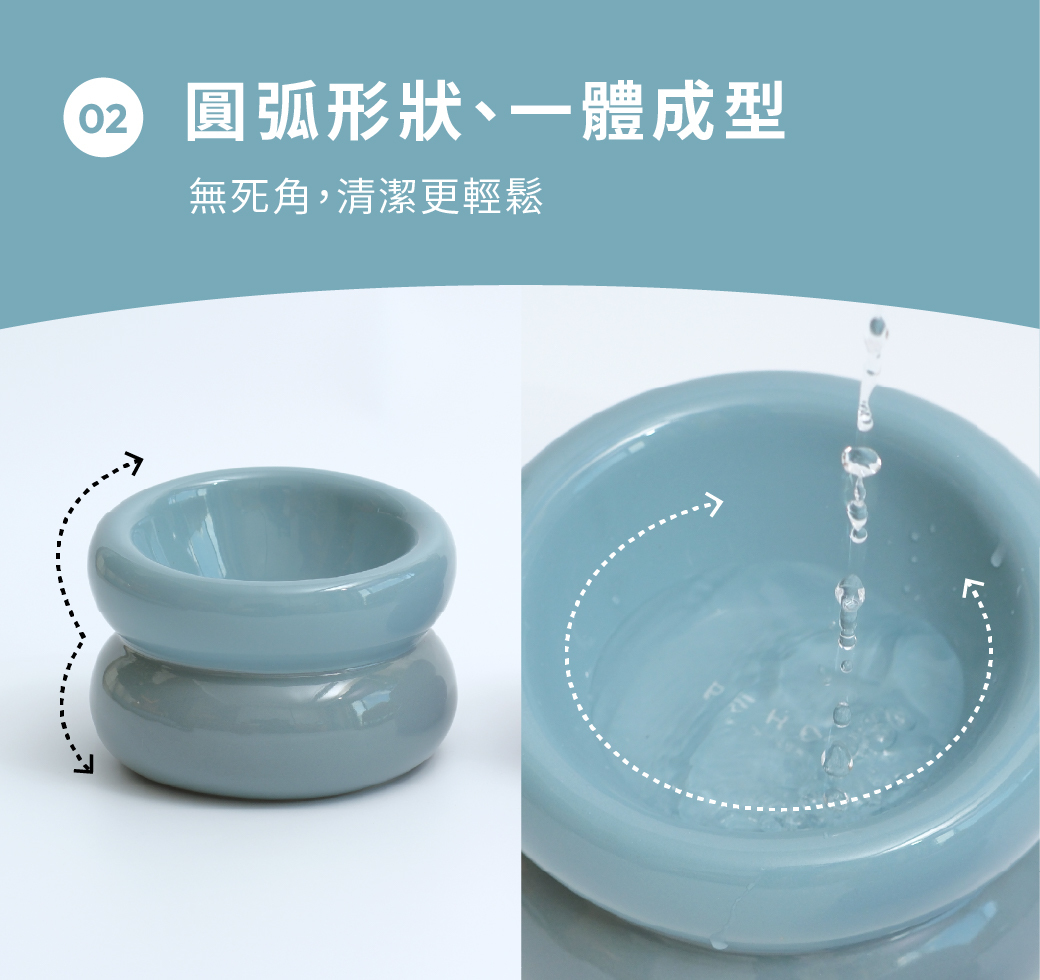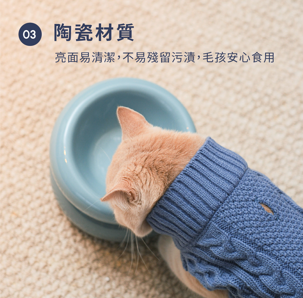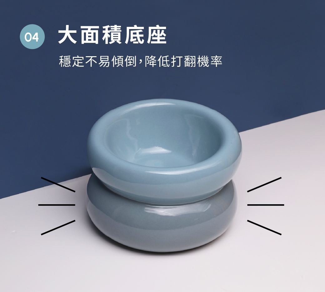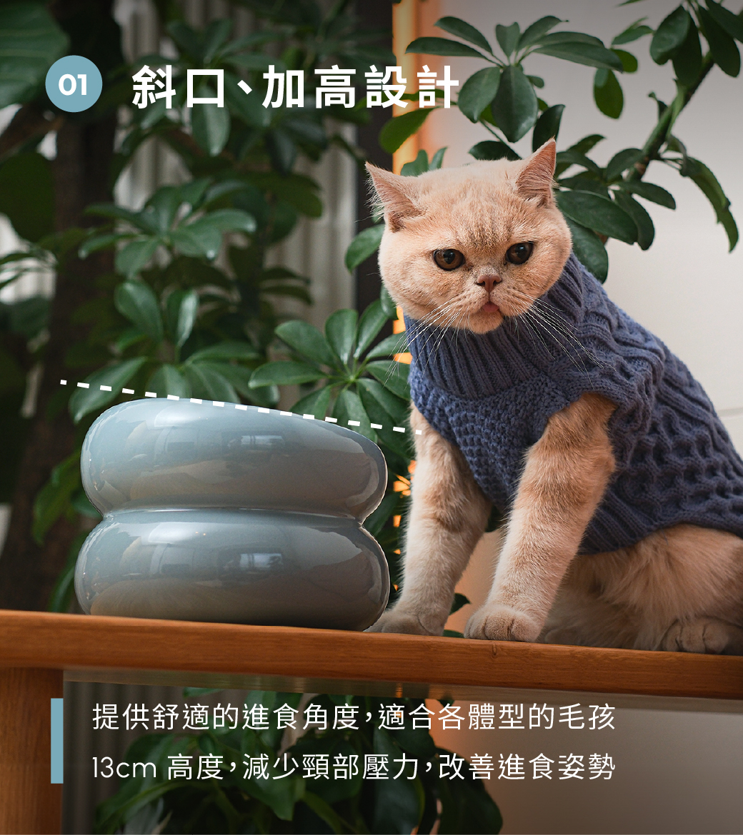 斜口設計提供舒適進食角度,底座加高保護毛孩脊椎,碗內圓弧無死角好清洗,大面積底座設計不易移位和傾倒