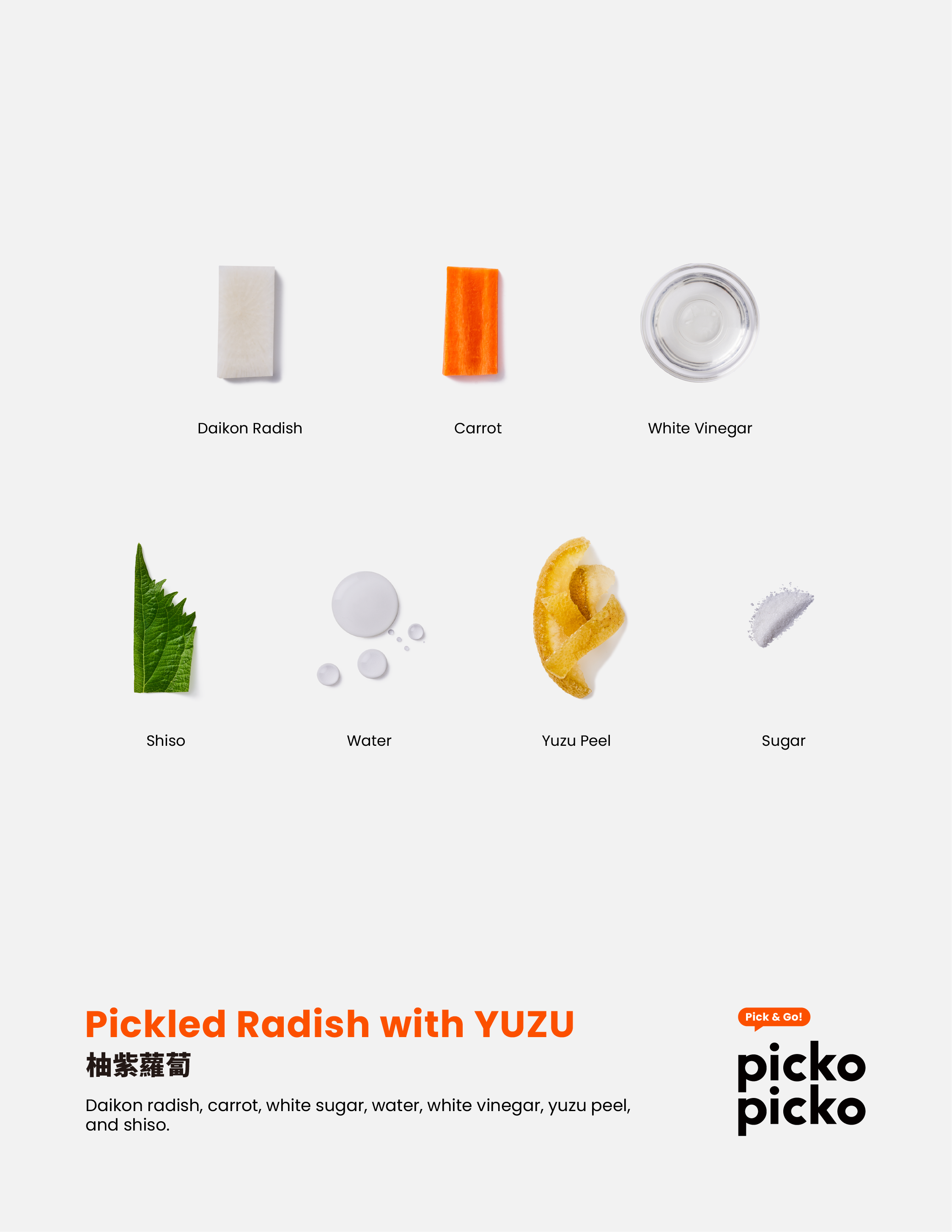 選用日本品種白蘿蔔,搭配柚子皮的清新酸甜與紫蘇的獨特香氣,爽脆口感中帶有果香餘韻