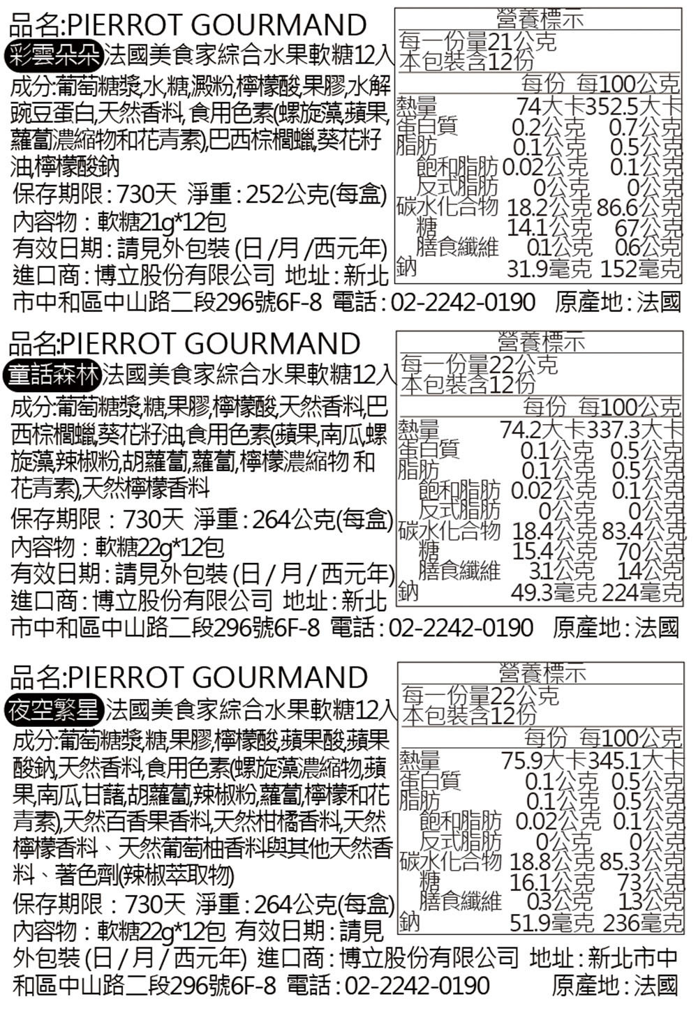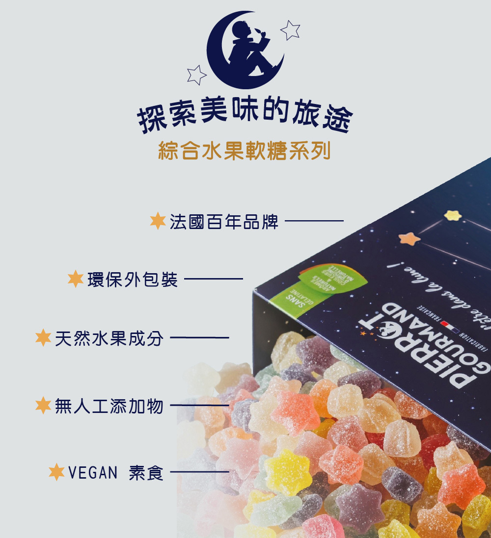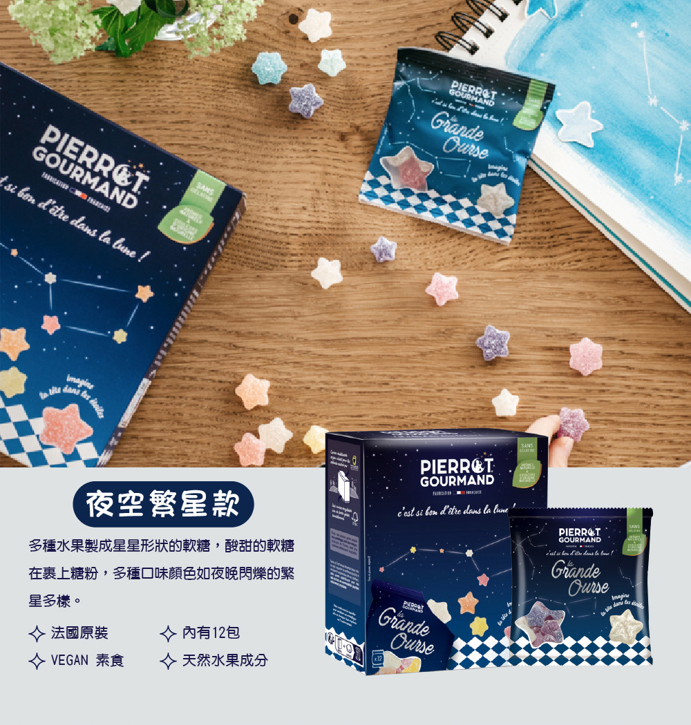 The Great Bear 美食家綜合水果軟糖 – 夜空繁星 12入 成分:葡萄糖漿,糖,果膠,檸檬酸,蘋果酸,蘋果酸鈉,天然香料,食用色素(螺旋藻濃縮物,蘋果,南瓜,甘藷,胡蘿蔔,辣椒粉,蘿蔔,檸檬和黑醋栗),天然百香果香料,天然柑橘香料,天然檸檬香料、天然葡萄柚香料與其他天然香料、著色劑(辣椒萃取物)縮物),天然檸檬調味料。