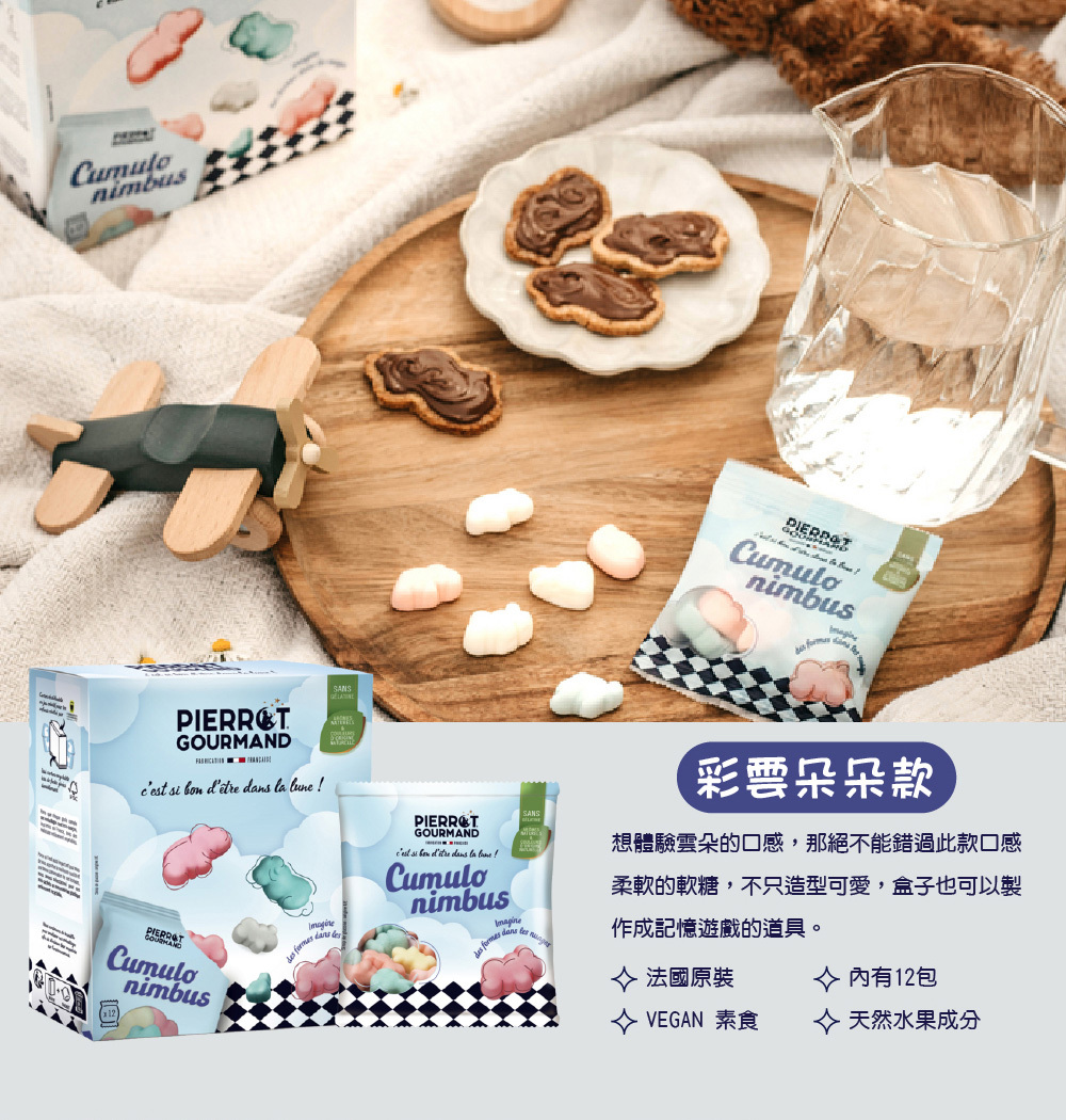Cumulonimbus 美食家綜合水果軟糖 – 彩雲朵朵 12入 成分:葡萄糖漿,水,糖,澱粉,檸檬酸,果膠,水解豌豆蛋白,天然香料, 食用色素(螺旋藻,蘋果,蘿蔔和黑醋栗濃縮物),巴西棕櫚蠟,葵花籽油,檸檬酸鈉
