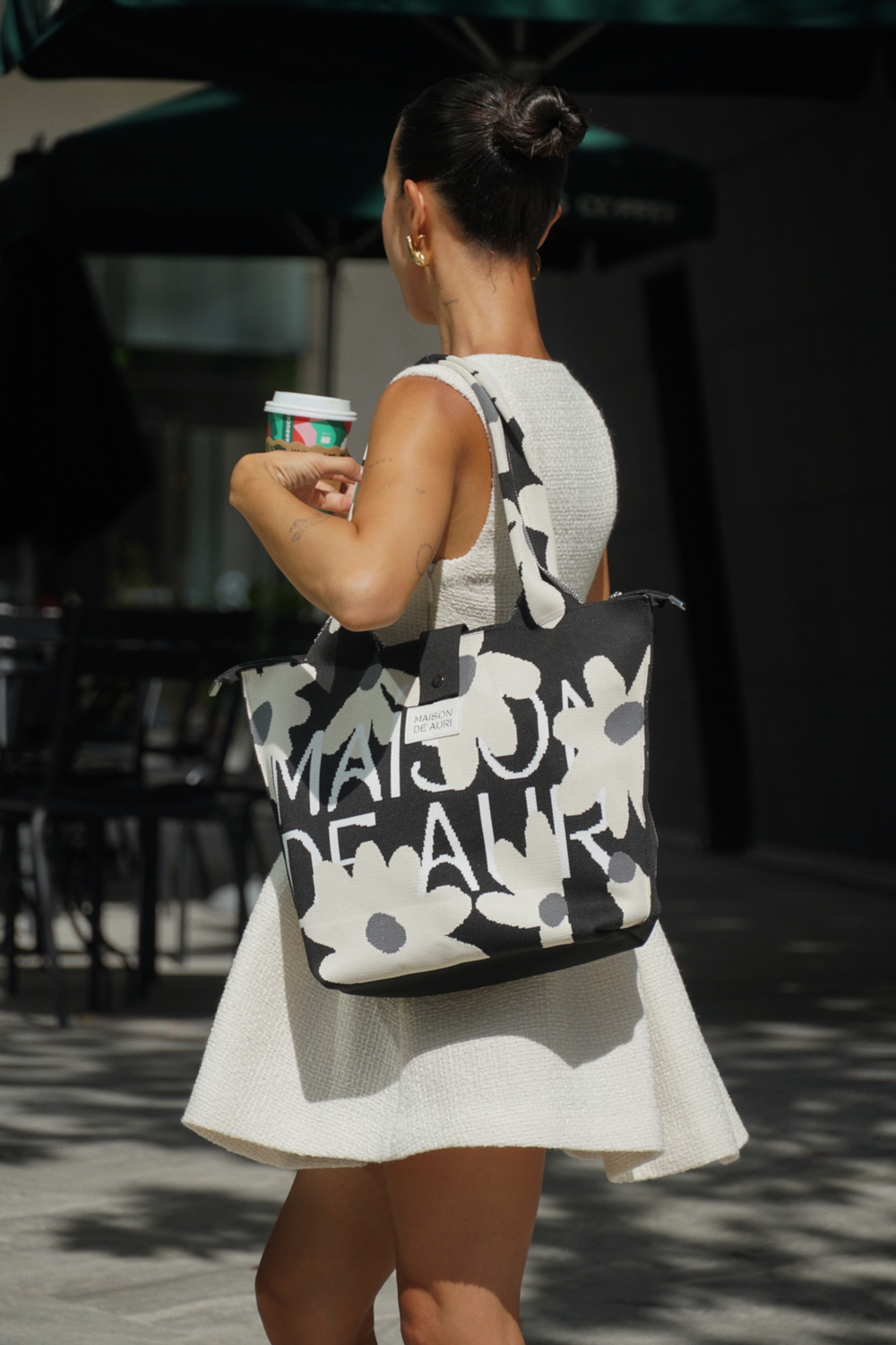 MAISON DE AURI 的品牌字樣巧妙隱藏於灰白花卉之間,低調中透露不凡品味,