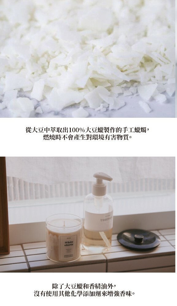 從大豆中萃取100%大豆蠟製作的手工蠟燭,不含 石蠟/ 防腐劑 / 鄰苯二甲酸酯、從大豆中萃取出大豆蠟製作的手工蠟燭,跟石蠟製作出來的蠟燭不同,不含任何環境有害物質以及燻製物,除了大豆蠟與香精油外,沒有使用其他化學添加劑來增強香味。