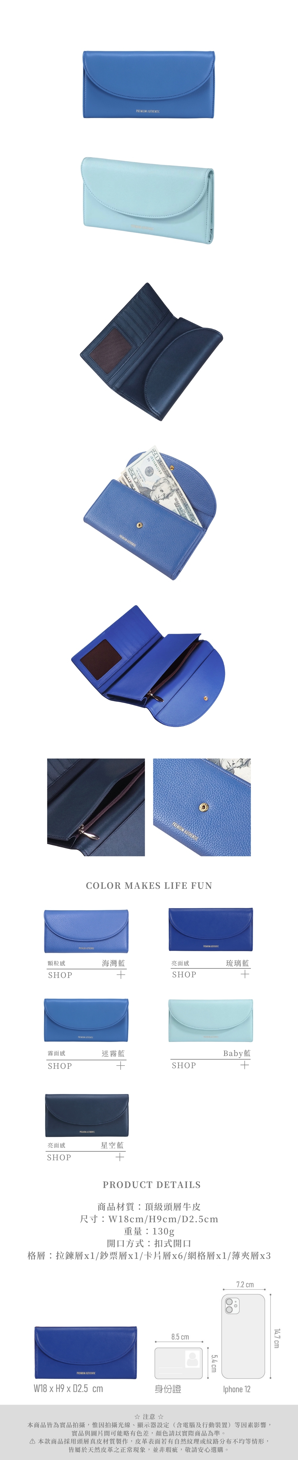 暮海皮夾的色系就像走訪義大利卡布里島,世界最奇幻美麗的藍調色彩,多格卡層、鈔票層欄位及拉鍊零錢袋,分類收納清楚實用,微笑簡約的時尚輪廓是一款一見傾心的真皮扣片長夾。