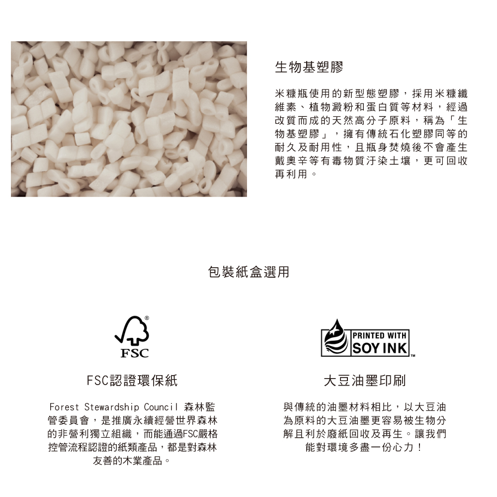 秉持著「讓地球與我們一起變美」的綠色理念,研發米糠低碳環保瓶器;