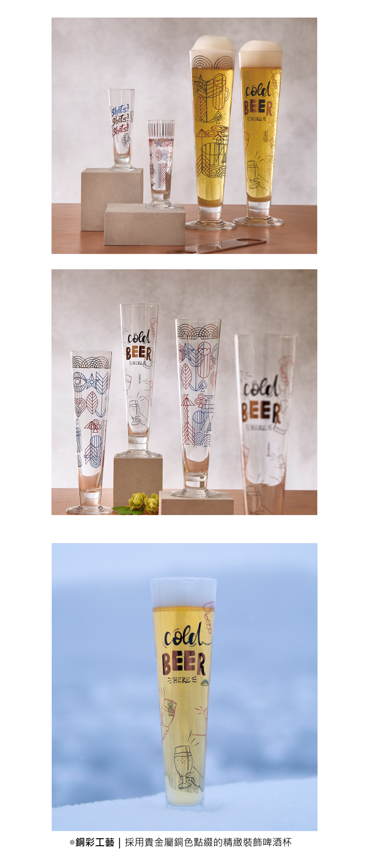 ◎銅彩工藝|採用貴金屬銅色點綴的精緻裝飾啤酒杯。