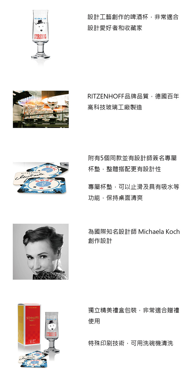 德國RITZENHOFF:創立超過200年以上,為德國最知名與先進的高科技玻璃工廠之一。於1992年邀請世界級設計大師德國 Sieger Design策劃,將杯子當作畫布,透過旗下300多個各行各業傑出的設計師、建築師、插畫家、廣告創意人、藝術家等,一同盡情創作,從杯型、圖案到包裝等,全都是精心規劃,巧思創作。產品從啤酒杯、烈酒杯、香檳杯,紅白酒杯、伏特加酒,到氣泡酒和水杯及威士忌杯等,不斷的推陳出新,不但是完美的禮物,也很快開始引起收藏家的注意。目前RITZENHOFF 產品已行銷超過60個國家以上,深受世界各地的喜愛。