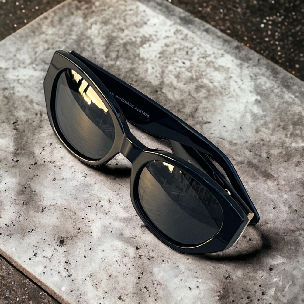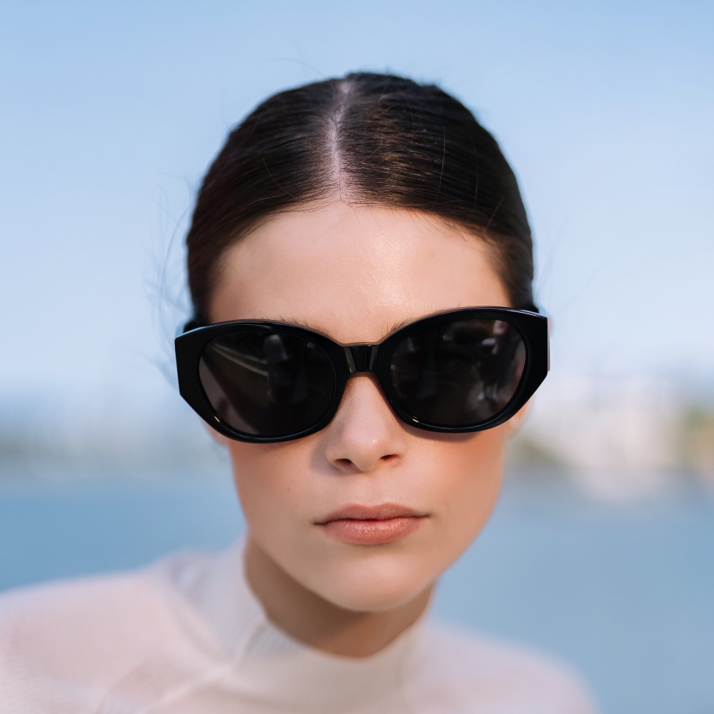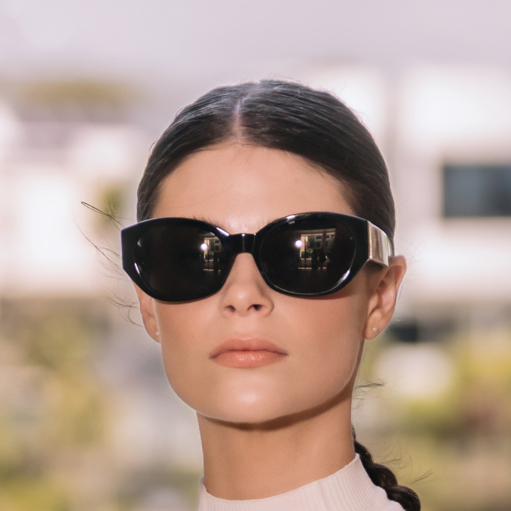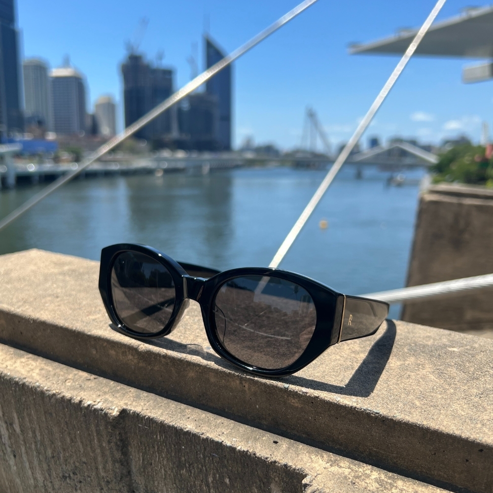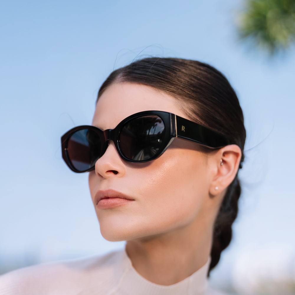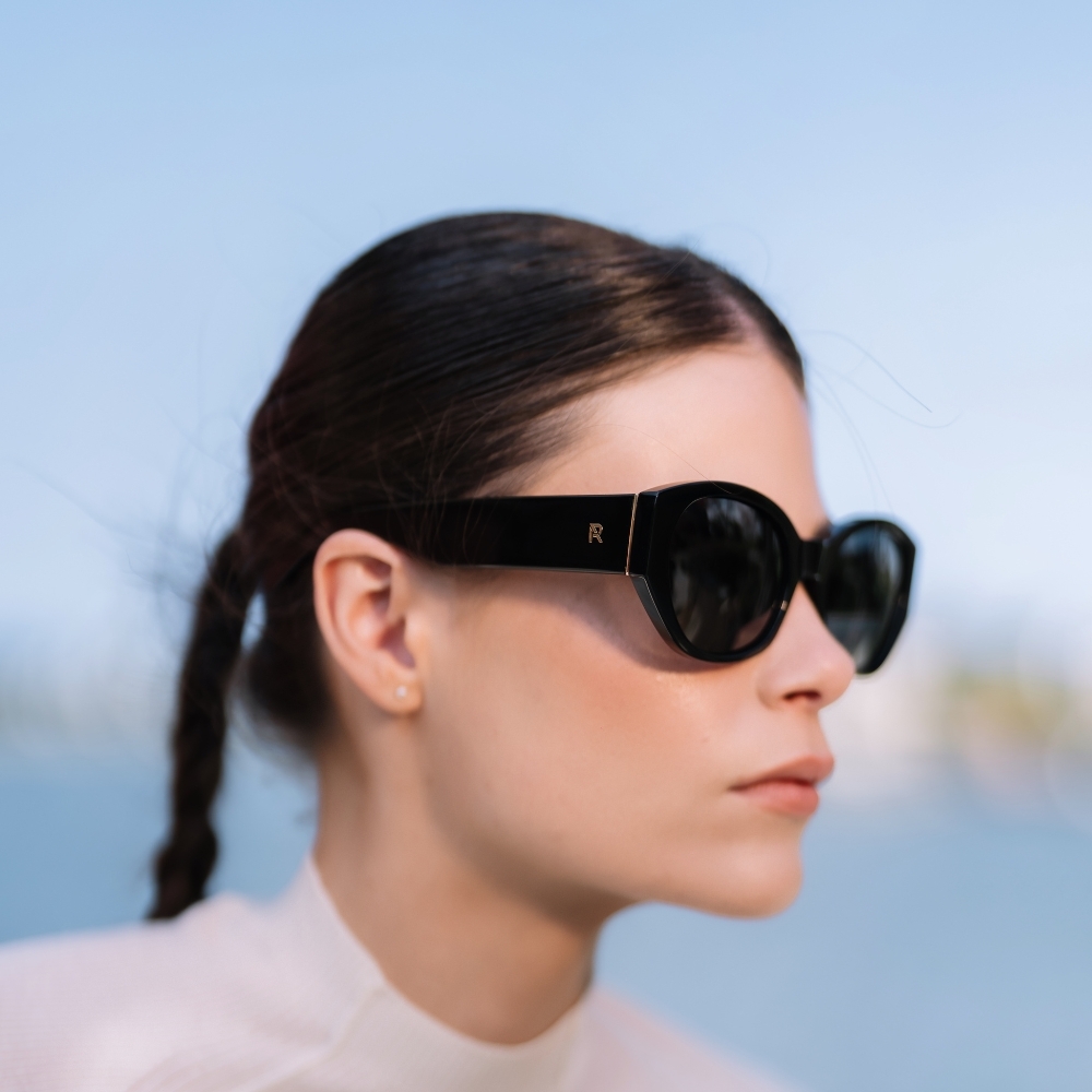 Lydia貓眼形太陽眼鏡融合了復古和女性魅力為靈感,醋酸纖維鏡框飾金色金屬件,沿著鏡臂則刻有經典的R標誌,增添品牌元素。