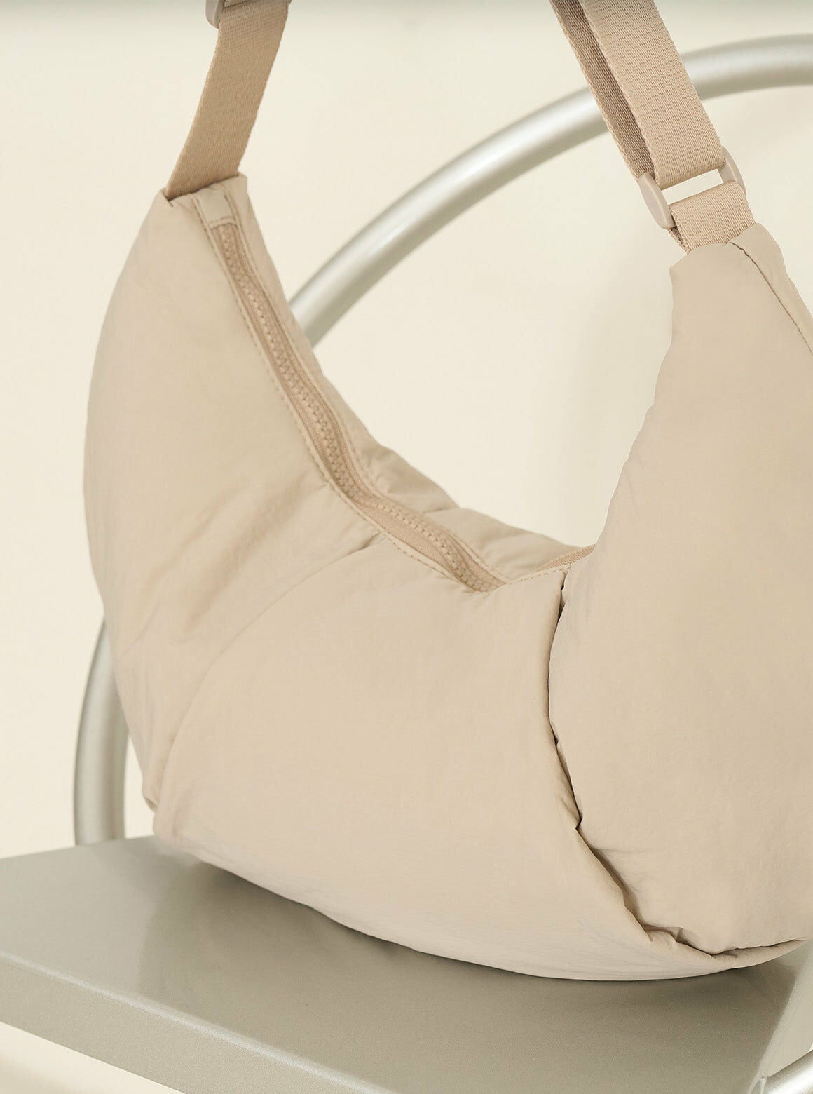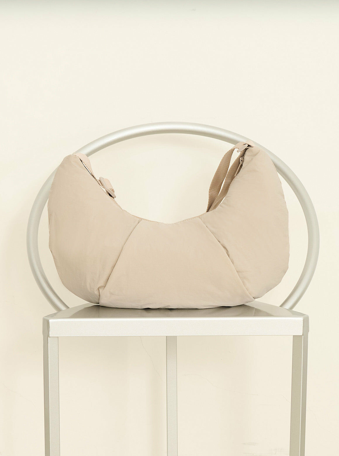 【設計】獨特的牛角形輪廓和底部立體打褶造型,背起時展現自然垂墜弧形,細緻背帶可依照身形調整長度或者側背