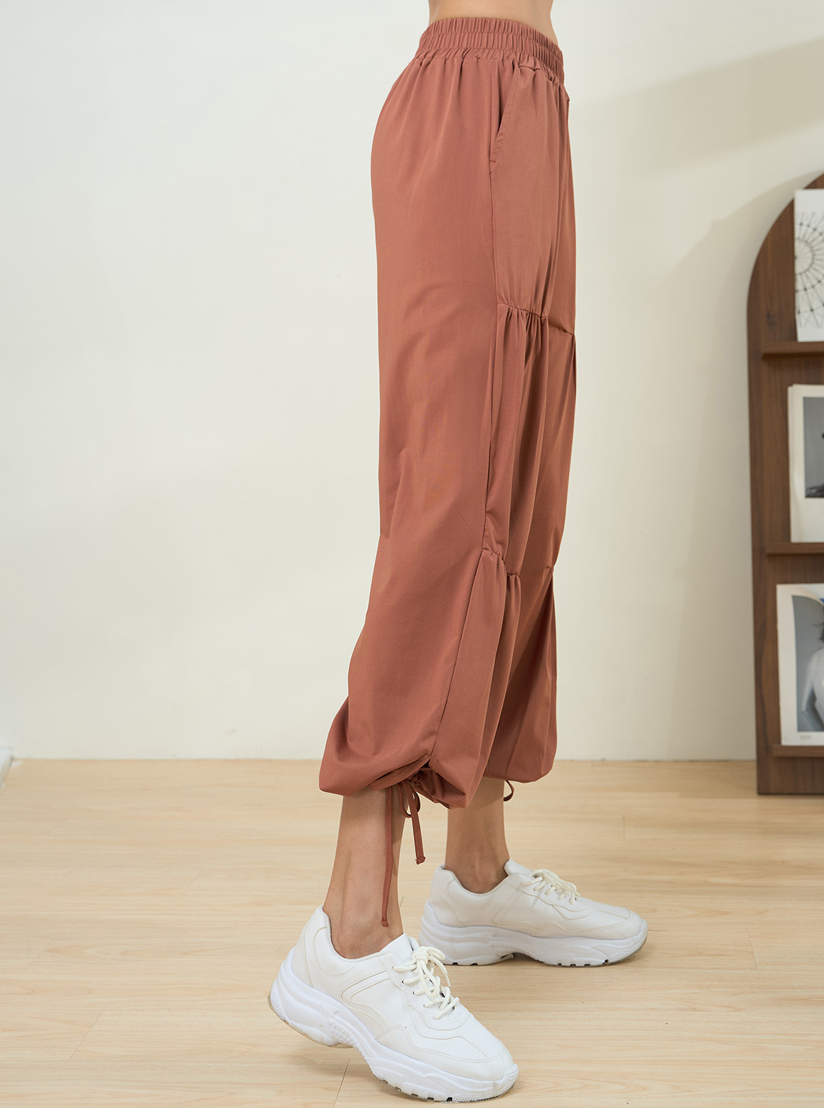 細緻抽褶設計,視覺集中修飾直腿線條