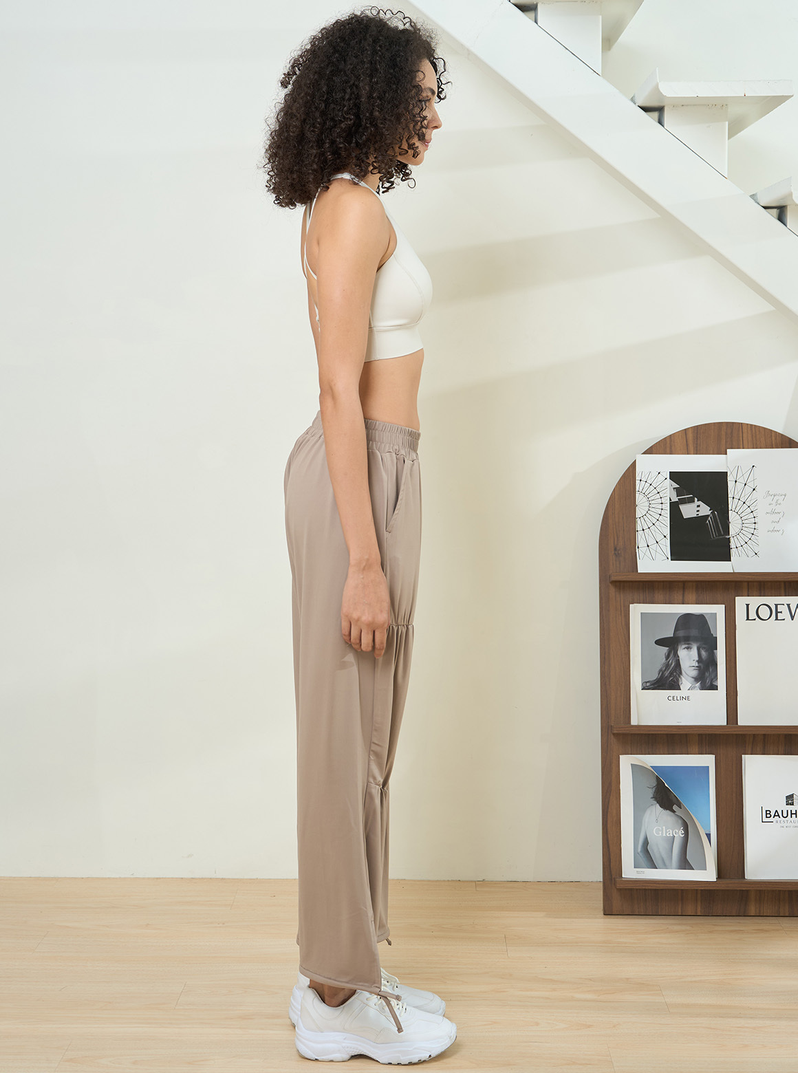 休閒系列寬褲,輕軟舒彈布料呈現自然垂度,走動時輕盈貼合肌膚;寬褲細緻抽褶設計,視覺集中修飾直腿線條,腰部採整圈鬆緊腰頭,雙線爬線避免內捲, 版型身形包容度高。設有兩種褲長可一褲兩穿,褲口內有隱藏式抽繩,可落地亦可束口穿著 ,為嬌小到高個女孩增加穿搭變化