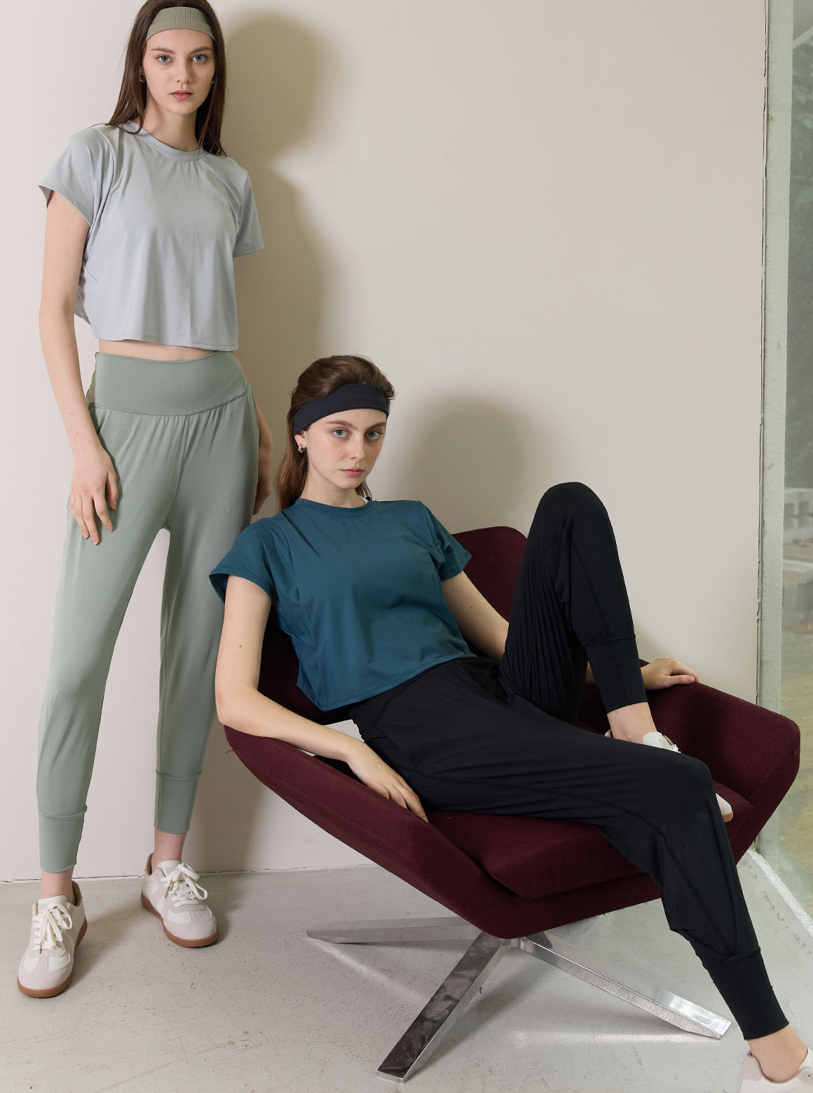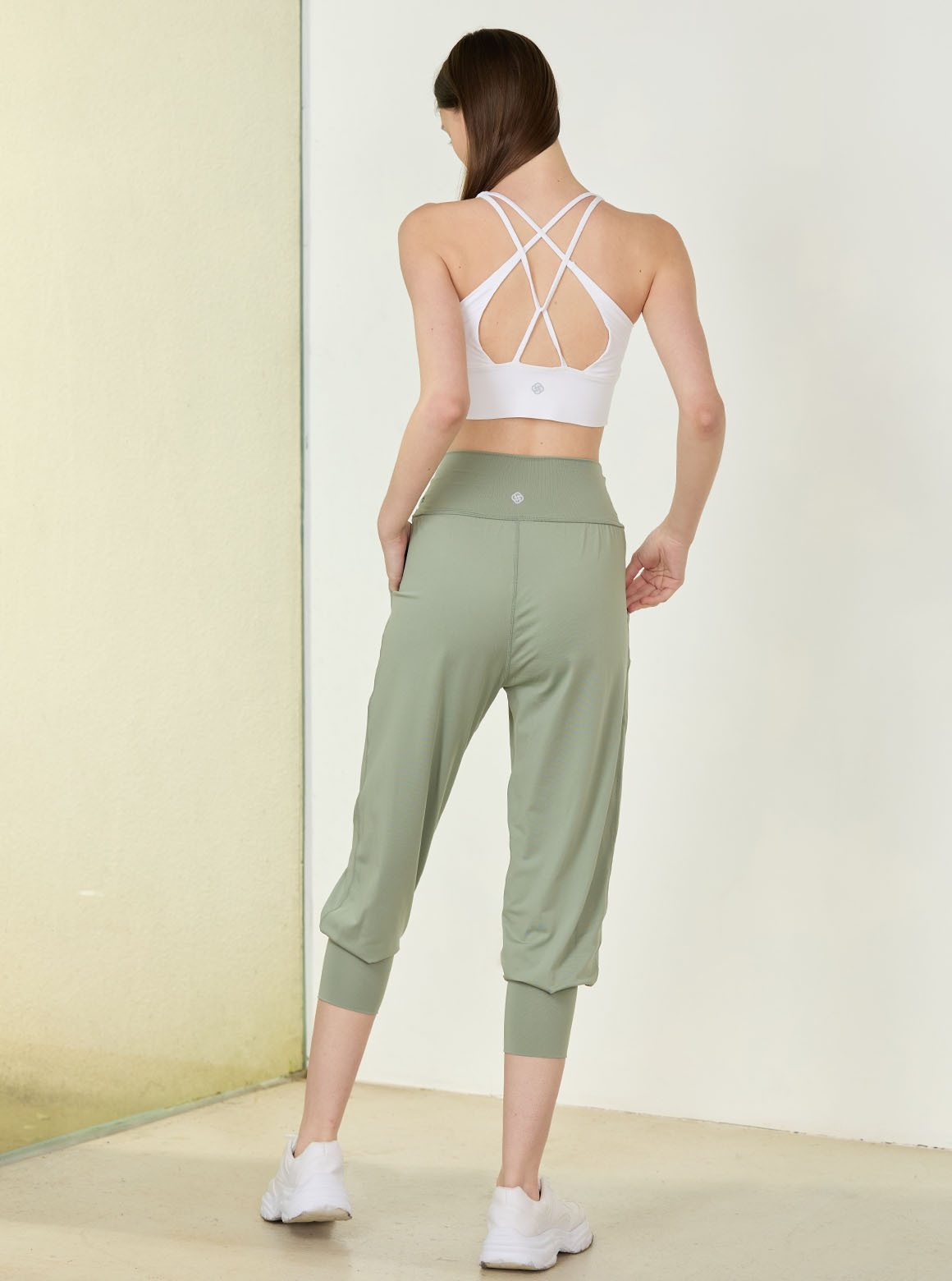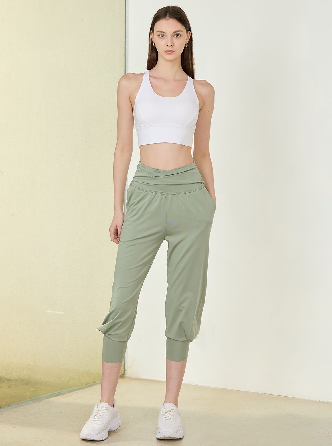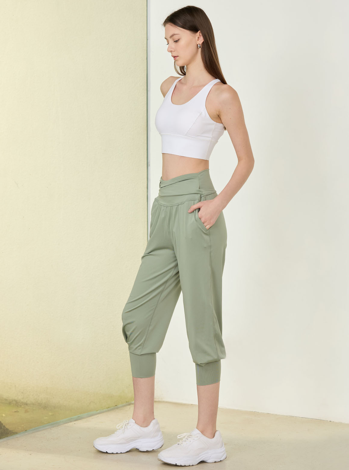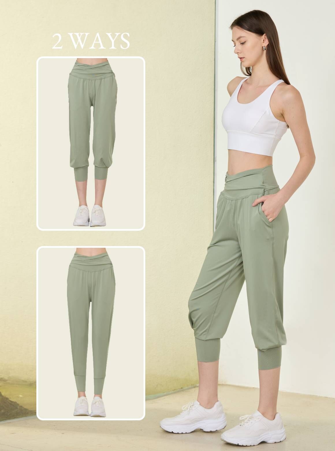 休閒系列褲款斜摺兩穿休閒褲,輕軟舒彈布料呈現自然垂度,走動時輕盈貼合肌膚,搭配褲束口合摺設計打造高度顯瘦修飾;腰部斜摺設計增強包覆效果,可翻前或至腰後,加強褲口長度讓腿部七分穿