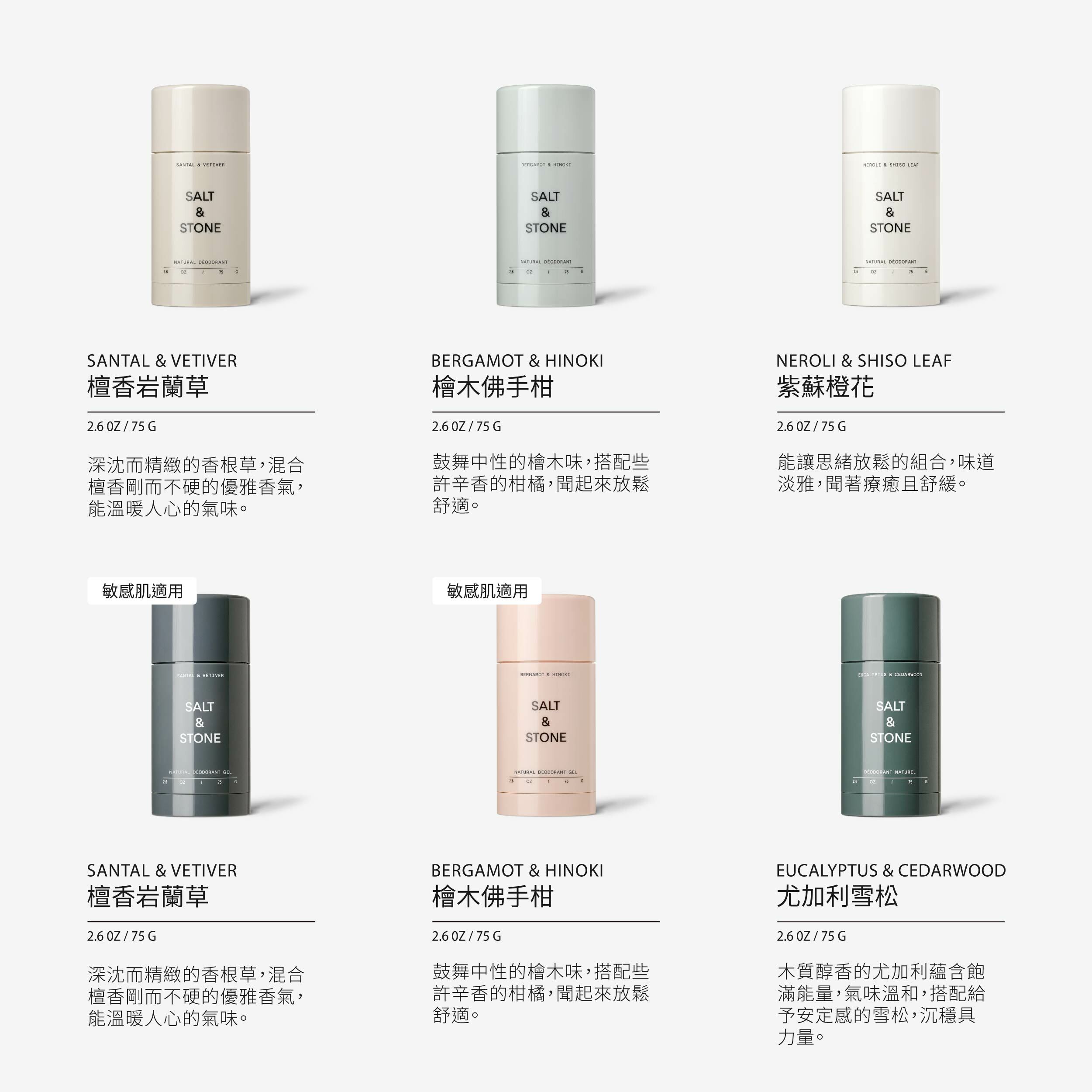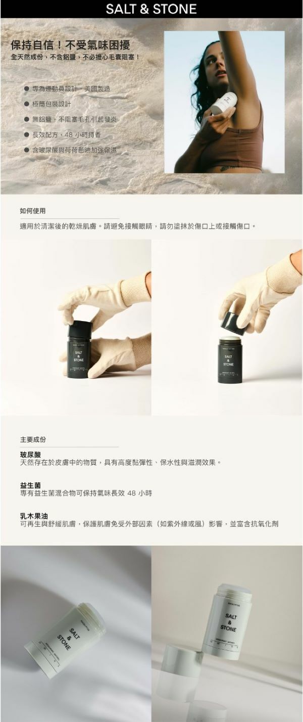 值得一提的是,SALT & STONE 體香膏全面不添加市面上止汗膏常見成分「鋁鹽」不避擔心毛囊阻塞而引起肌膚發炎問題,也不擔心致敏。