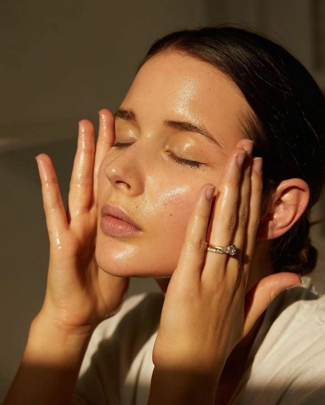 1)倒50元硬幣大小的清潔卸妝油到手掌心,在濕潤的皮膚上按摩。