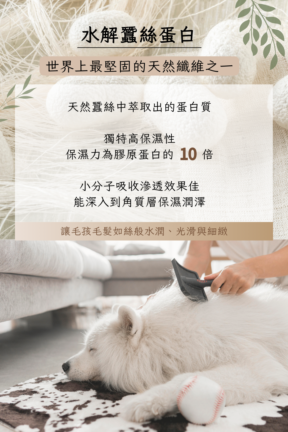 ✔添加水解蠶絲蛋白,維持皮毛水嫩絲滑