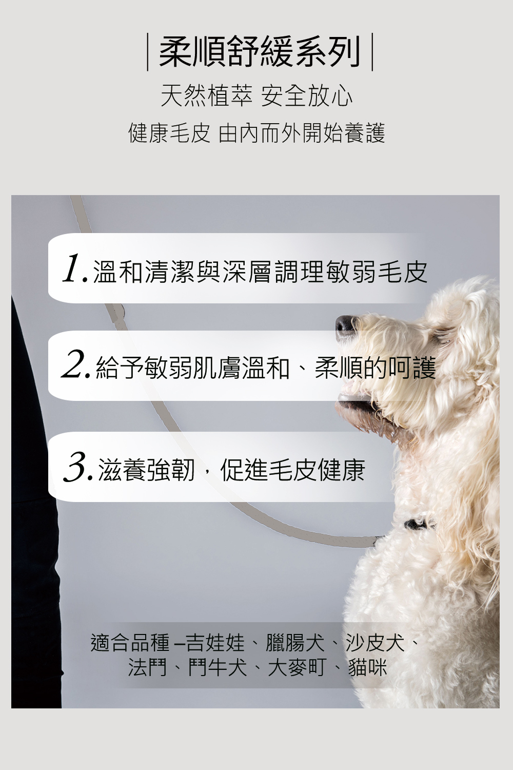 ⚫️柔順舒緩洗毛精 : 沉靜木質香,鎮靜、舒緩、滋養,溫和清潔與深層調理敏弱肌毛皮,滋養強韌,促進毛皮健康,給予敏弱肌溫和、柔順的呵護
