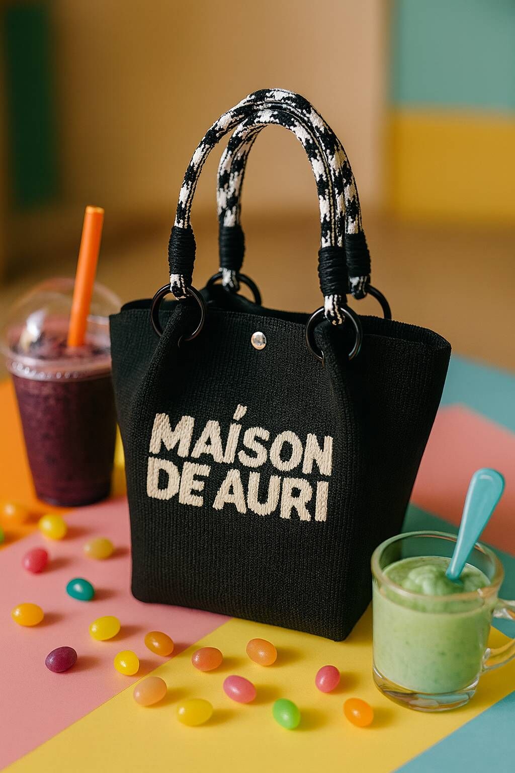 以黑為底,背面織上 MAISON DE AURI 品牌字樣毛絨,展現極簡卻搶眼的風格