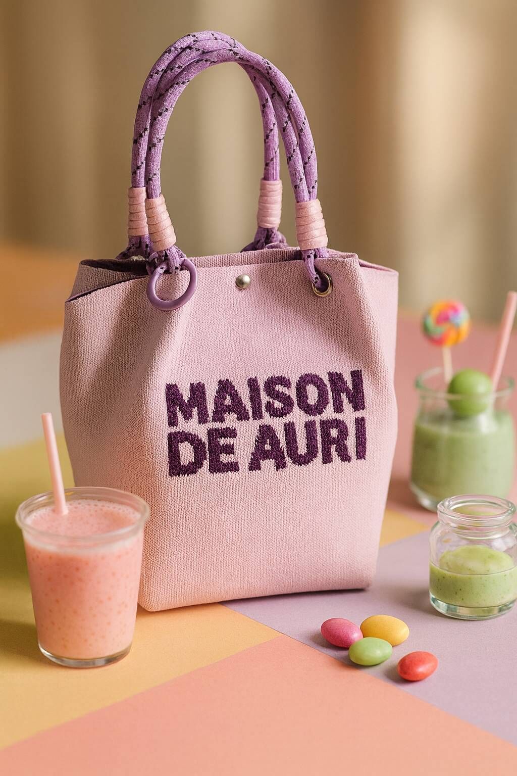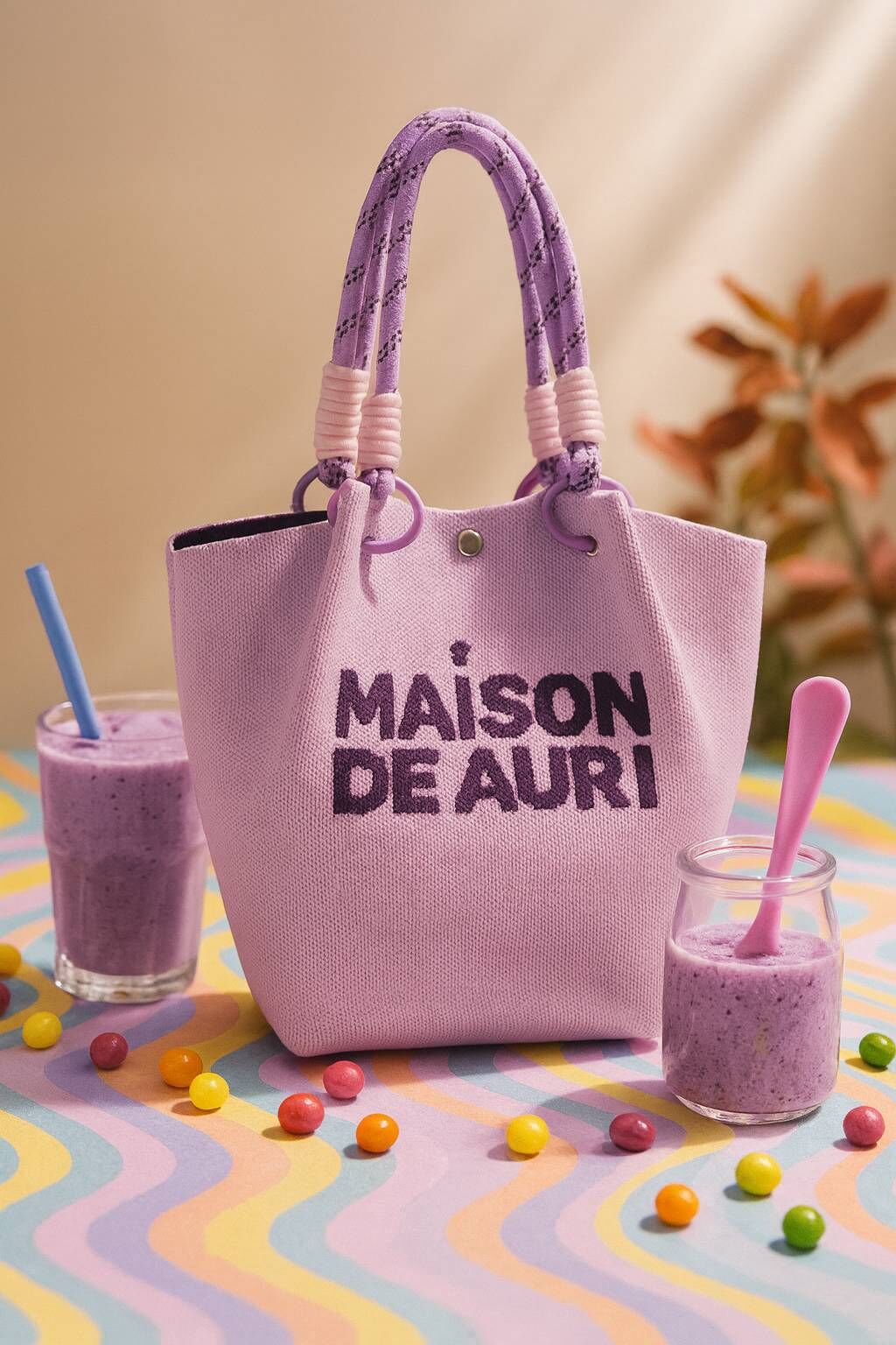 以淡紫色包身搭配深紫字樣與薰衣草色繩柄,靈感來自清爽的薰衣草優格果昔,優雅又帶點甜美氣息,適合溫柔系穿搭