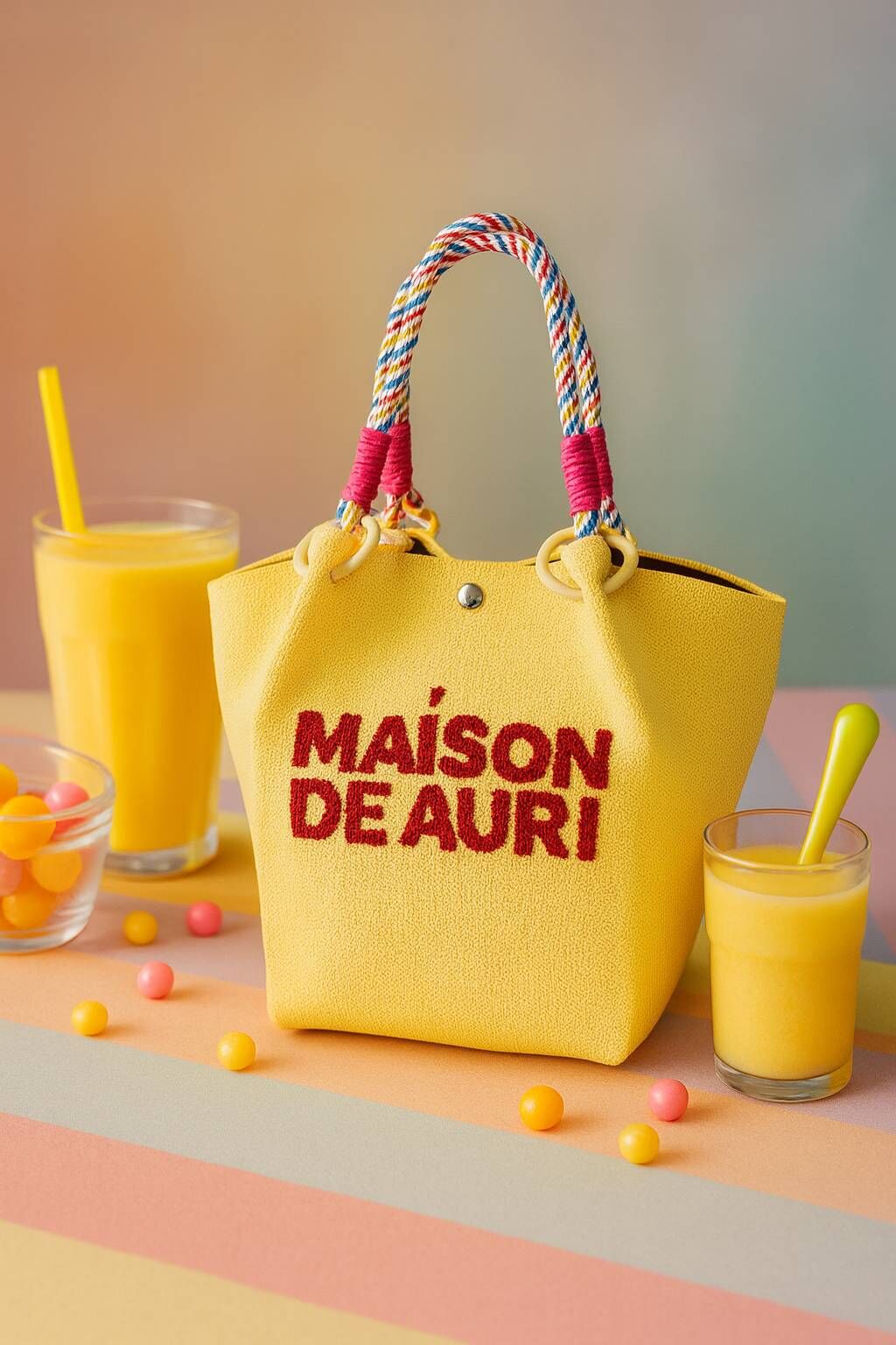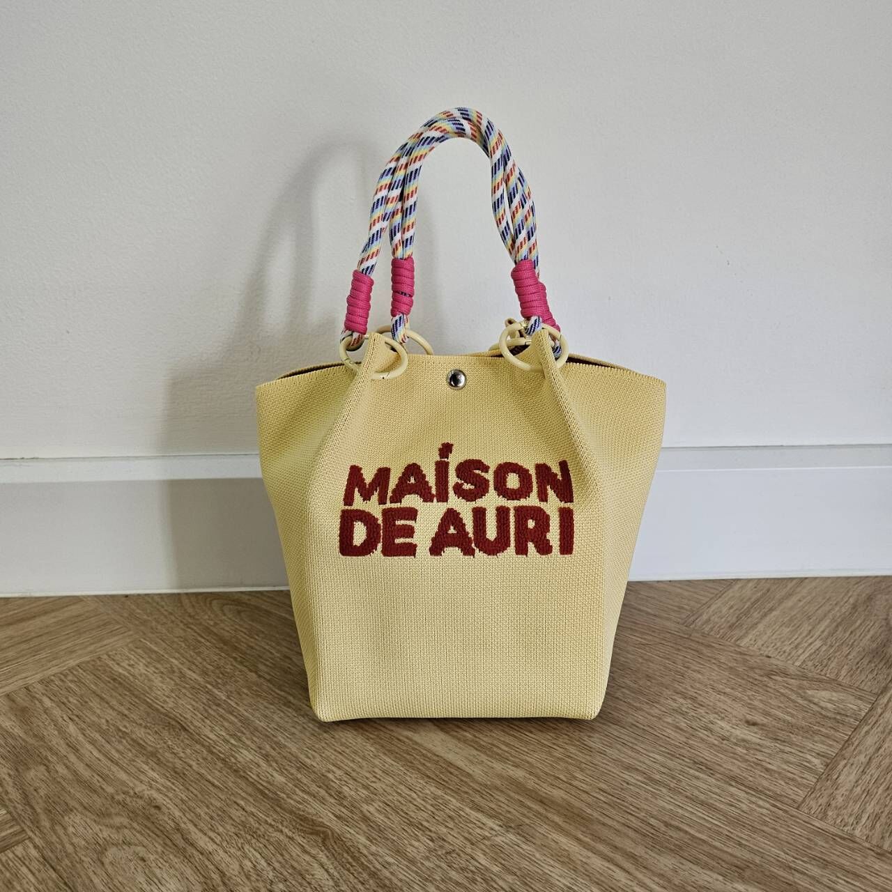 以黃為底,背面織上 MAISON DE AURI 品牌字樣毛絨,展現極簡卻搶眼的風格