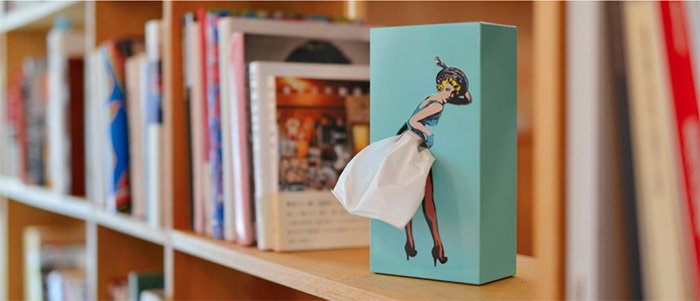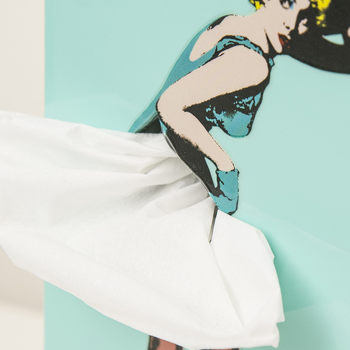 此款面紙盒的設計靈感來源於生活中的細節,由於裙子和紙巾具有相似性,抽紙的瞬間,設計師以海報女郎脫裙子為概念設計,巧妙的將兩個形象融合在一起。