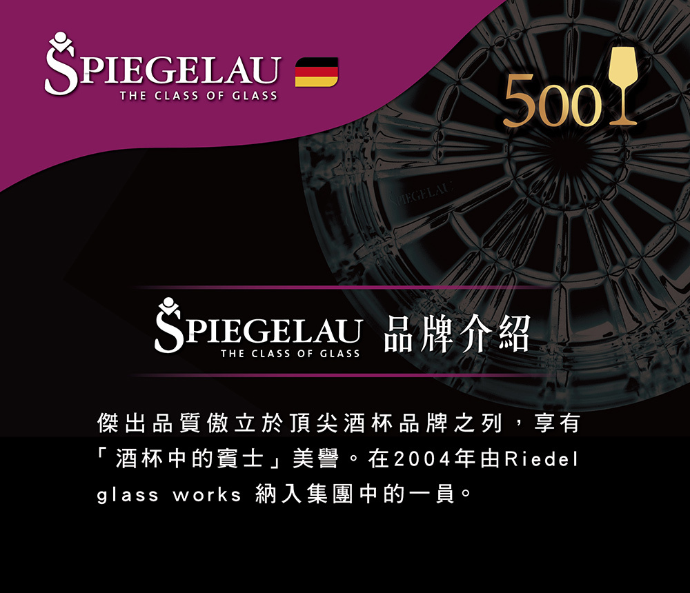 擁有500年歷史的無鉛酒具品牌Spiegelau,起源於德國巴伐利亞的一個古老玻璃製造區,最早被提及於1521年Erasmus Mospurger先生的遺囑裡,當時是為歐洲皇室宮廷製造精美鏡子的玻璃工廠。19世紀初,在經歷工廠重建與現代化革新後,開始以頂尖水晶玻璃工藝著稱。Spiegelau至今仍保留傳統匠人手工玻璃吹管技術,並以現代化生產結合卓越設計,打造出形制優美、晶瑩透亮的水晶玻璃杯。傑出的產品品質讓Spiegelau一直傲立於最頂尖的酒杯品牌之列,並享有「酒杯中的賓士」美譽。在2004年由Riedel glass works納入集團中的一員。