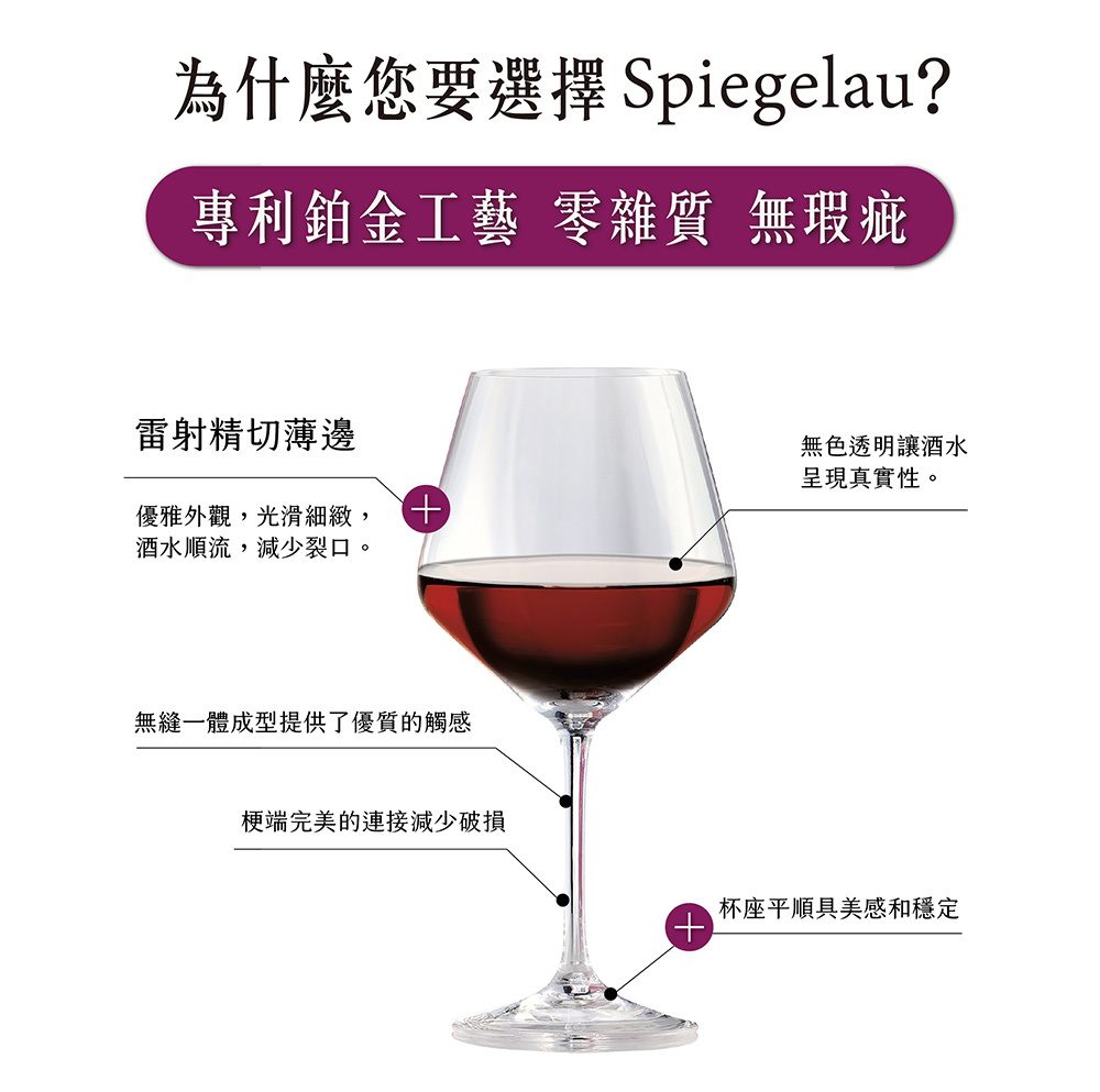 Spiegelau秉承德國嚴謹的生產製造工藝,每一只無鉛水晶玻璃杯,作工精良,杯口以雷射切割,平滑如絲。