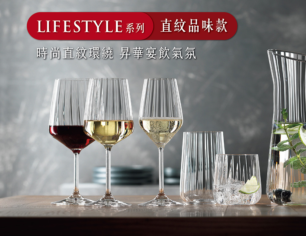 生活風格系列杯身上優雅的線條裝飾紋路,更加凸顯水晶玻璃的光彩透亮,可為餐桌增添質感。
