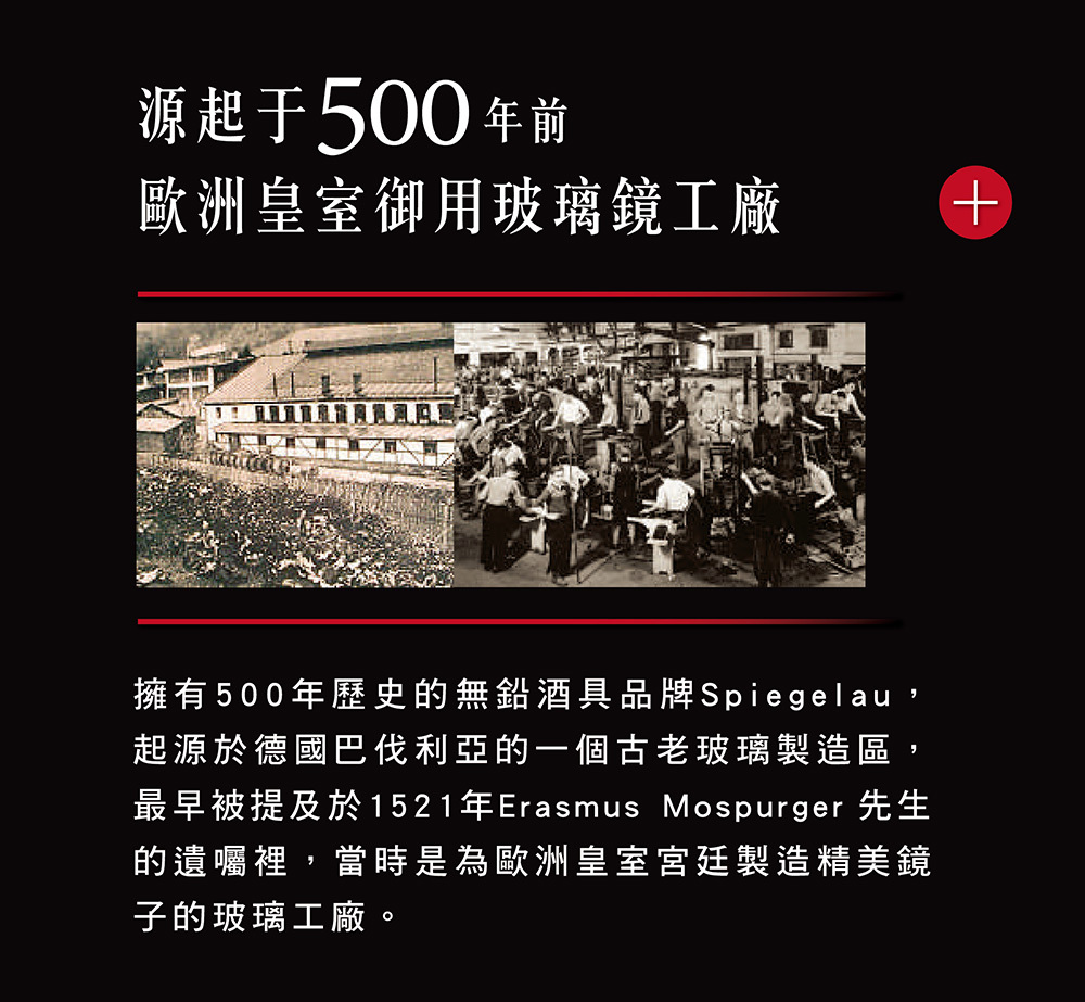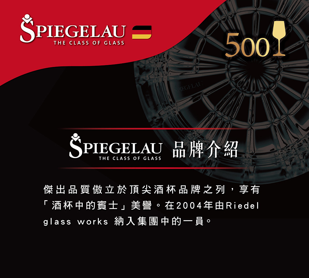 擁有500年歷史的無鉛酒具品牌Spiegelau,起源於德國巴伐利亞的一個古老玻璃製造區,最早被提及於1521年Erasmus Mospurger先生的遺囑裡,當時是為歐洲皇室宮廷製造精美鏡子的玻璃工廠。19世紀初,在經歷工廠重建與現代化革新後,開始以頂尖水晶玻璃工藝著稱。Spiegelau至今仍保留傳統匠人手工玻璃吹管技術,並以現代化生產結合卓越設計,打造出形制優美、晶瑩透亮的水晶玻璃杯。傑出的產品品質讓Spiegelau一直傲立於最頂尖的酒杯品牌之列,並享有「酒杯中的賓士」美譽。在2004年由Riedel glass works納入集團中的一員。