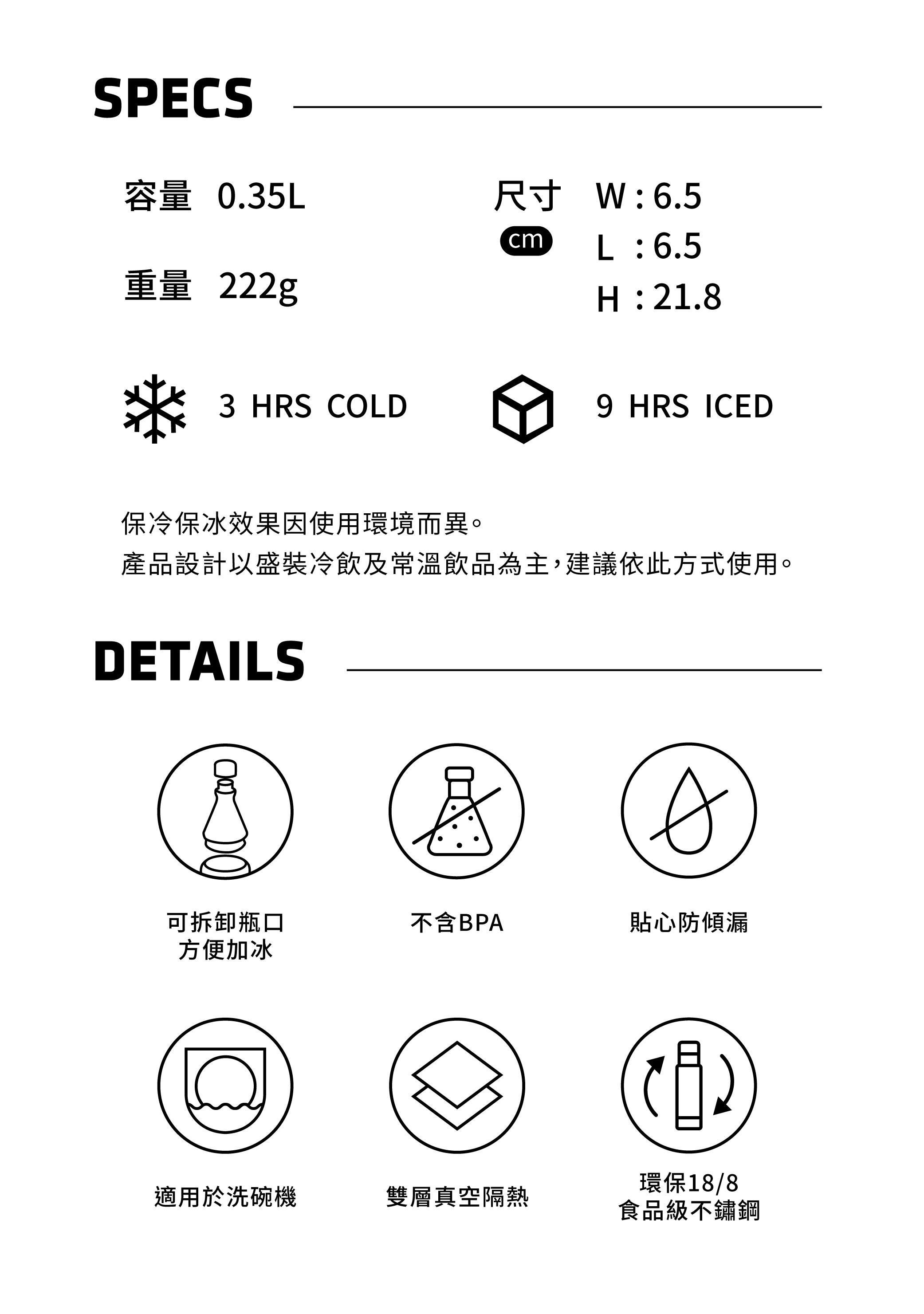 杯身: 18/8 (304) 食品級不銹鋼,不含 BPA