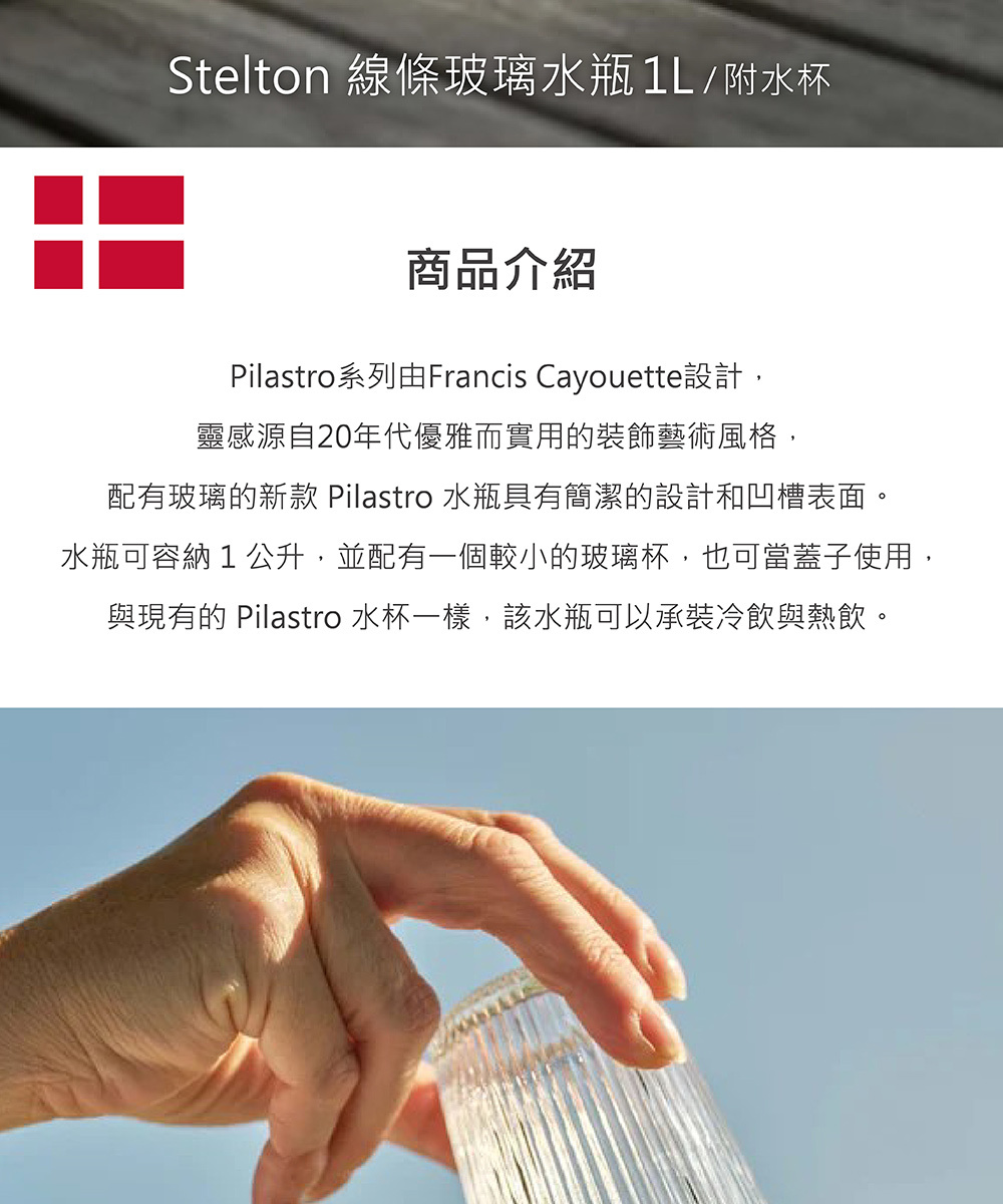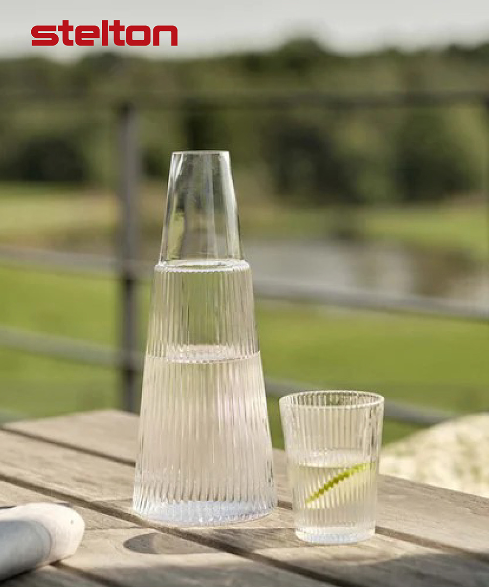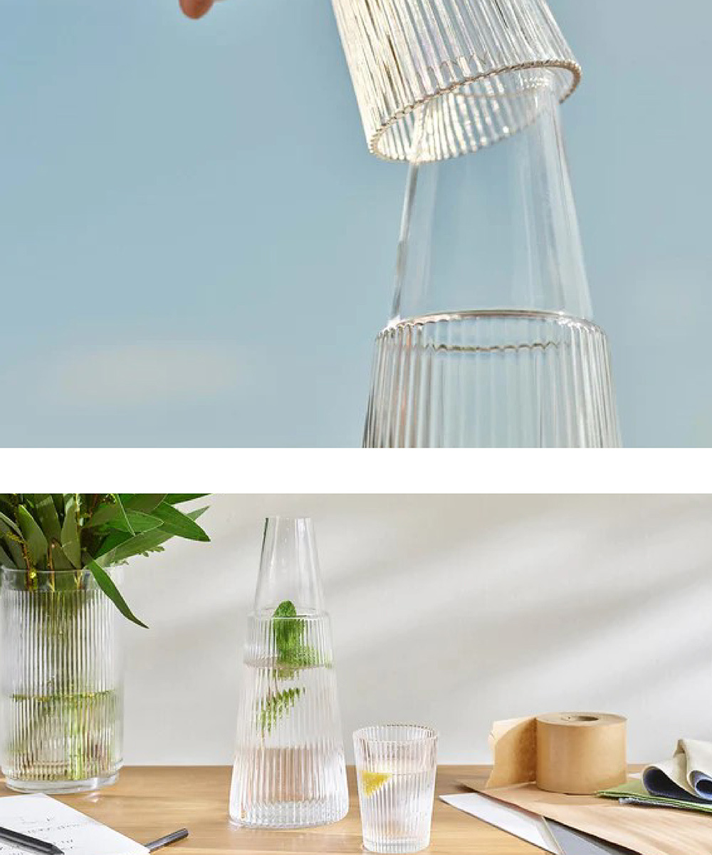 配有玻璃的新款 Pilastro 水瓶具有簡潔的設計和凹槽表面。