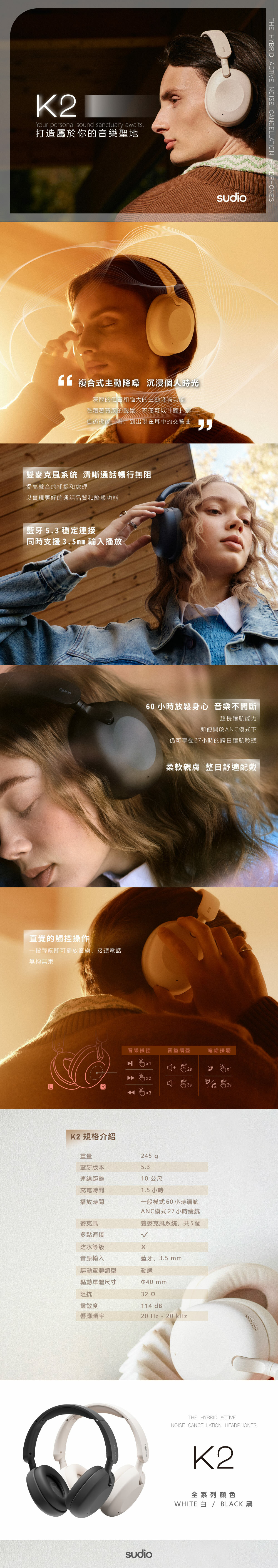 這一切都可在 sudio K2 複合主動式降噪耳罩式藍牙耳機中完成,打造出專屬於你的音樂聖地