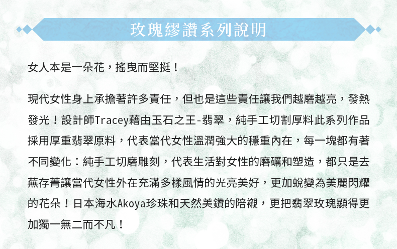 女人本是一朵花,搖曳而堅挺!採用厚重翡翠,代表當代女性溫潤強大的穩重內在,純手工切磨雕刻,代表生活對女性的磨礪和塑造,更加蛻變為美麗閃耀的花朵!日本海水Akoya珍珠和天然美鑽的陪襯,更把翡翠玫瑰顯得更加獨一無二而不凡!