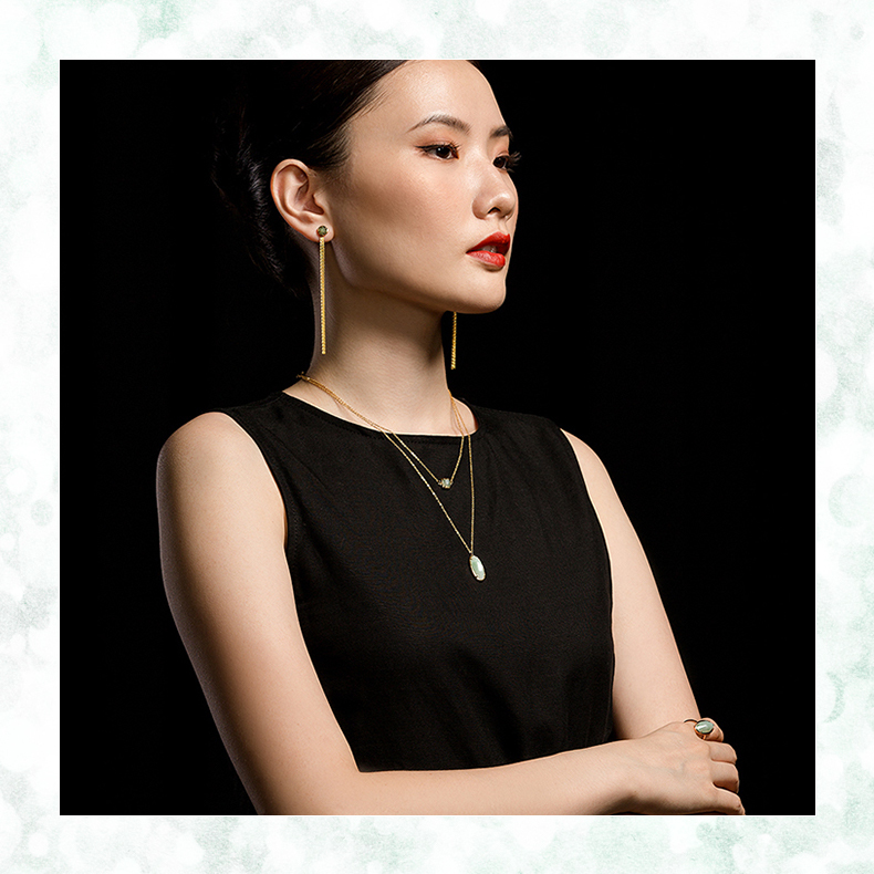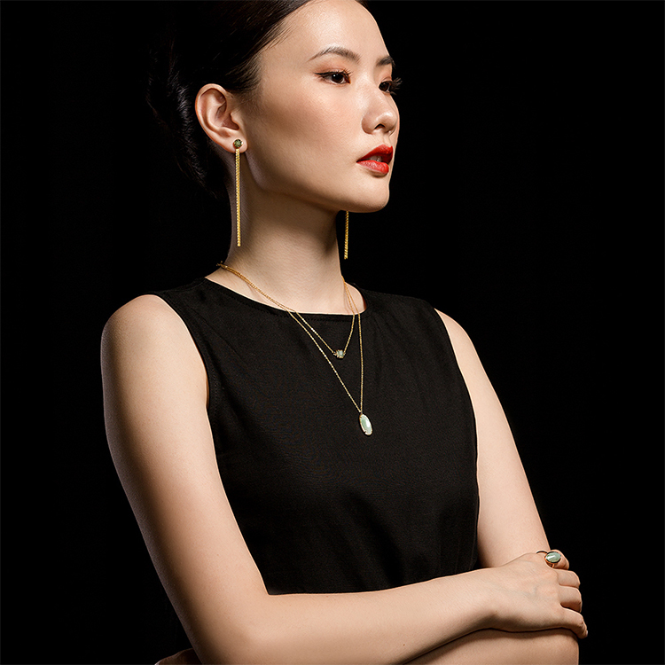 簡單俐落的線條和基礎圖形運用於輕奢翡翠系列,並採用湖水綠色系的冰糯種翡翠作為基調,營造出珠寶設計和生活的通透互融感,讓輕奢系列的珠寶設計可以沒有違和感地陪伴穿戴者應用於生活各場景!