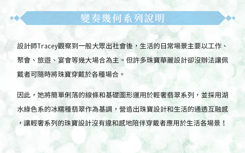 簡單俐落的線條和基礎圖形運用於輕奢翡翠系列,並採用湖水綠色系的冰糯種翡翠作為基調,營造出珠寶設計和生活的通透互融感,讓都會系列的珠寶設計可以沒有違和感地陪伴穿戴者應用於生活各場景!