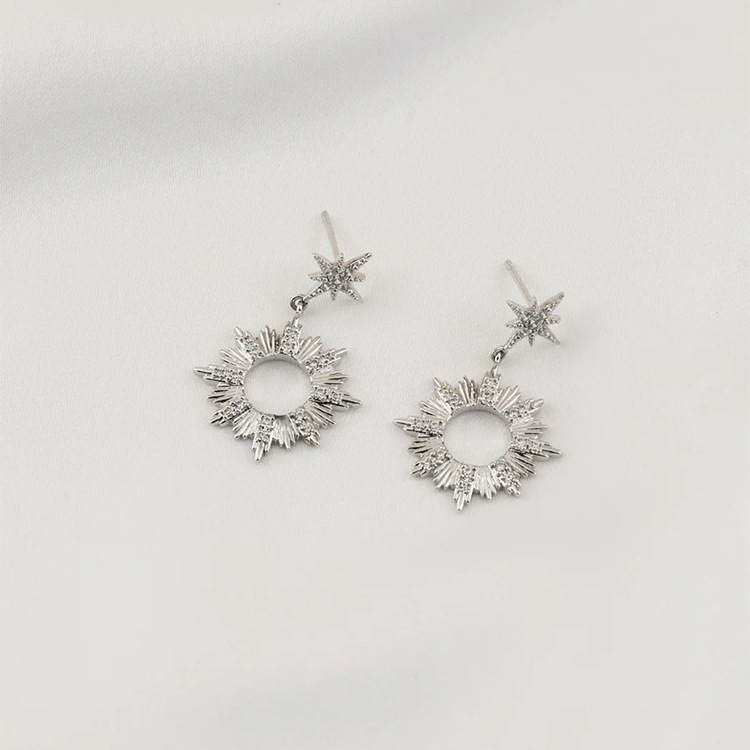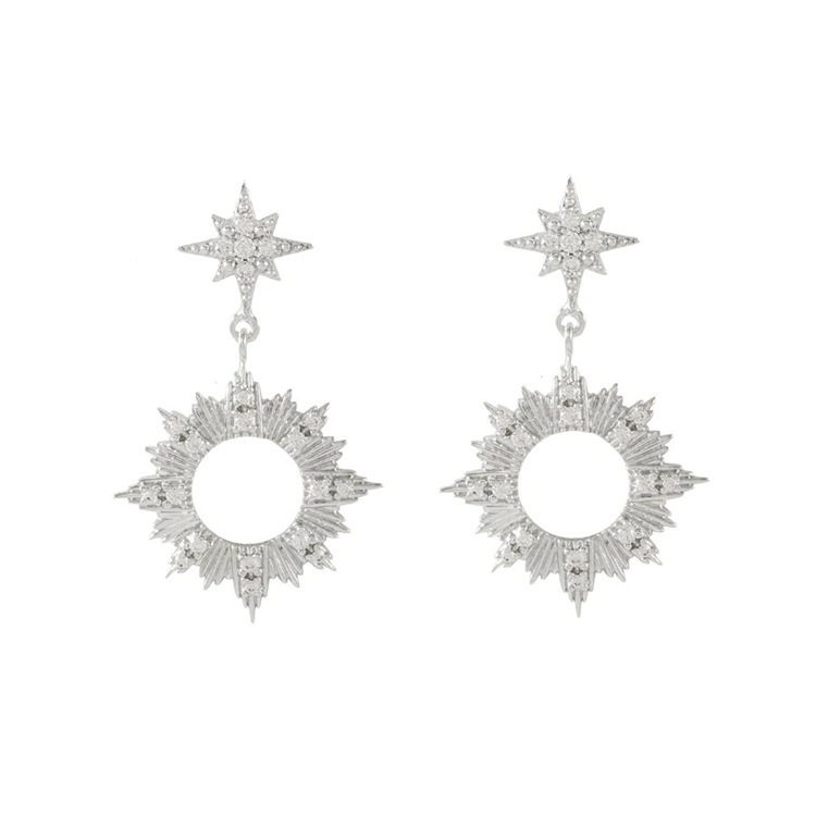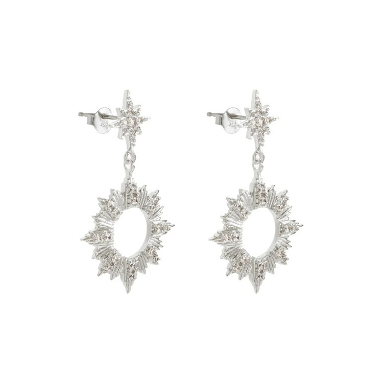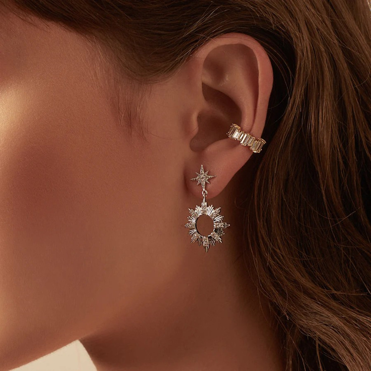 耳環配有一個可單獨佩戴的迷你新月型耳針和兩個互瑣圈型墜飾,小圈環繞著迷你星形圖案,大圈上排列著一整圈鋯石,可以戴在耳垂的前面或後面。