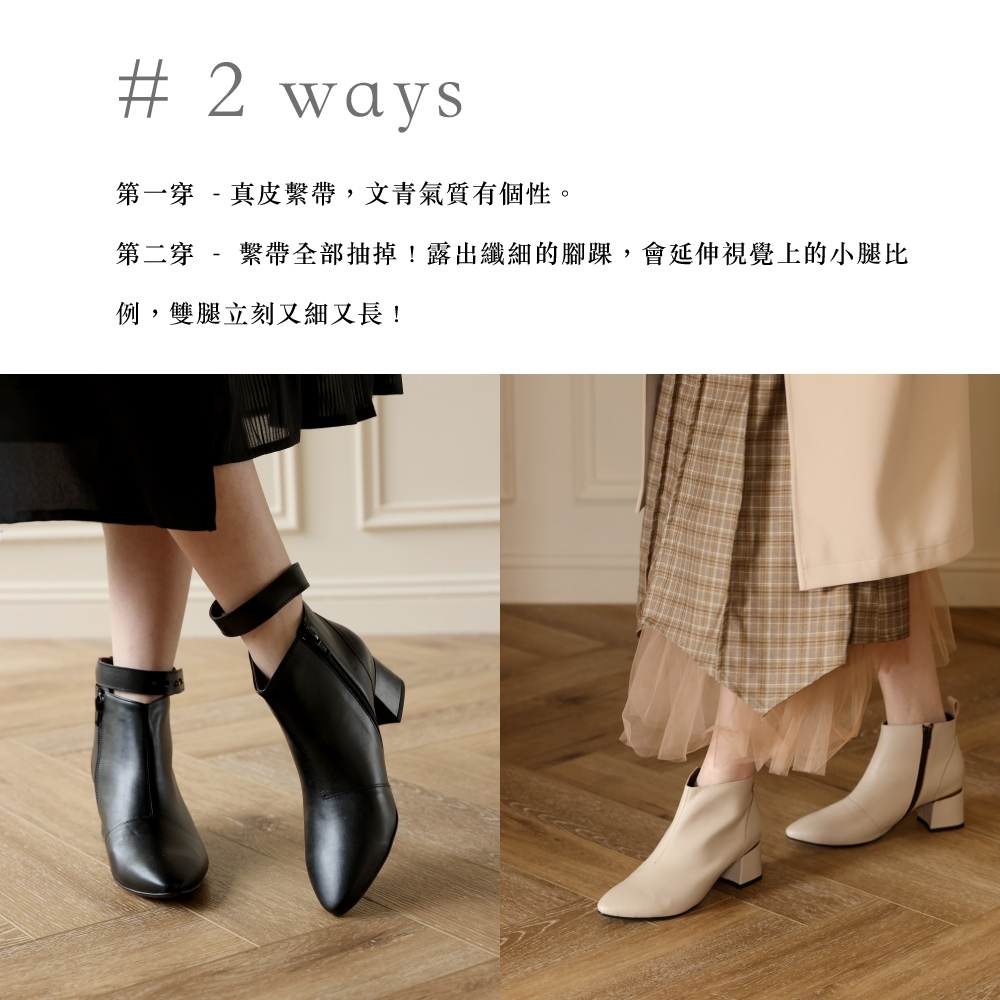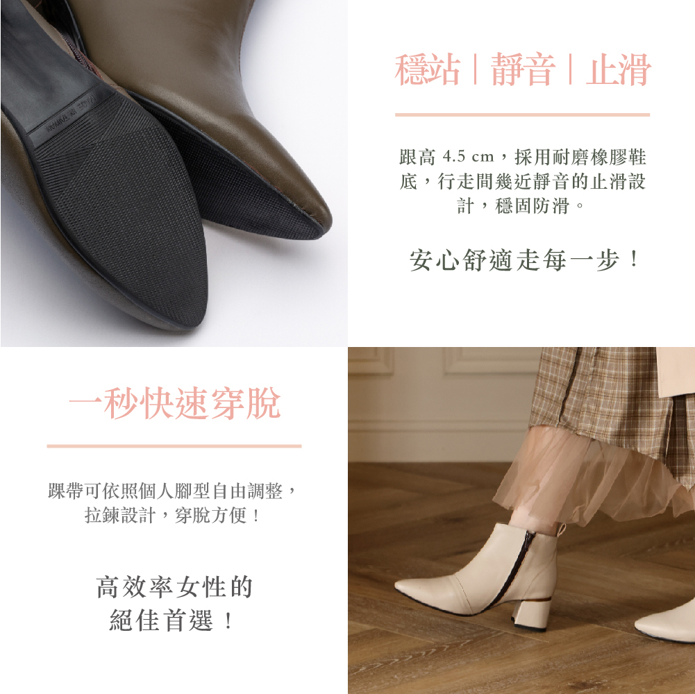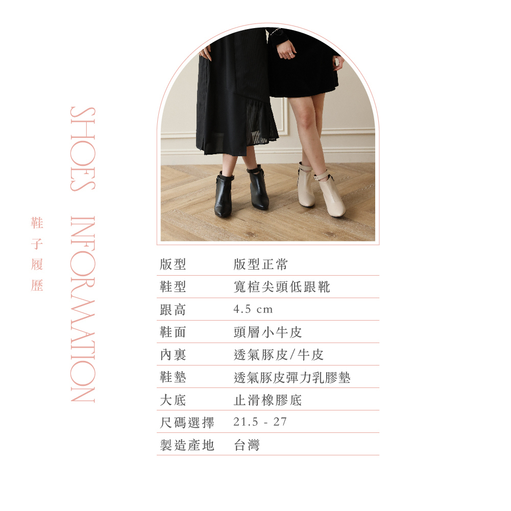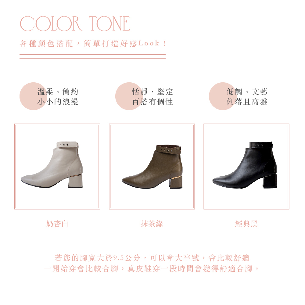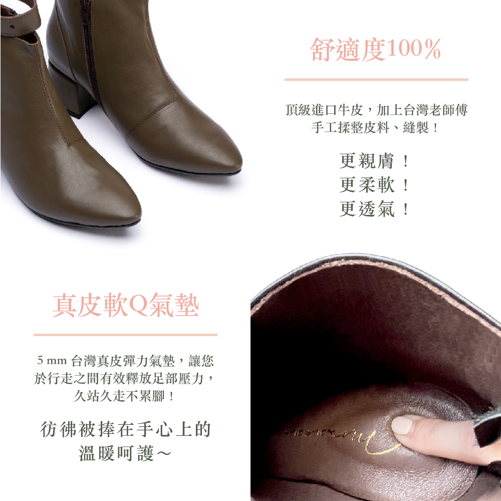 使用頂級純正牛皮,經過師傅無數次手工摔軟,柔軟彈性佳並保有天然毛孔,透氣排汗不悶腳。皮革全染非塗料,不掉色耐穿堅韌。5mm台灣手工真皮彈力氣墊,鞋跟4.5cm,絕對好走耐穿的中跟踝靴,真皮卯釘踝帶可拆卸。