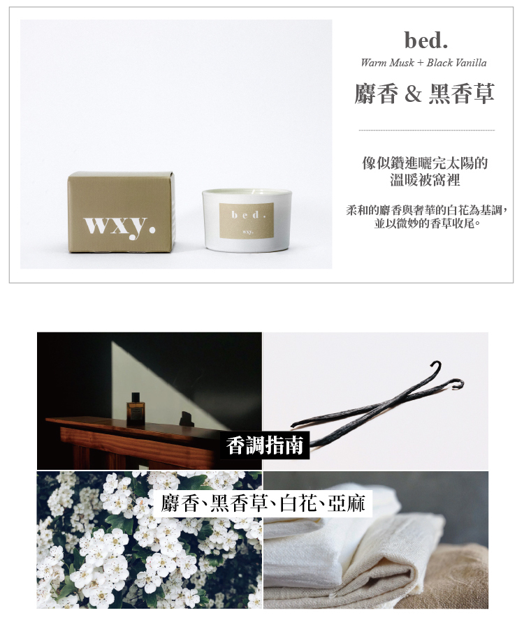 品名:wxy 經典蠟燭 (S)- bed. 麝香 & 黑香草