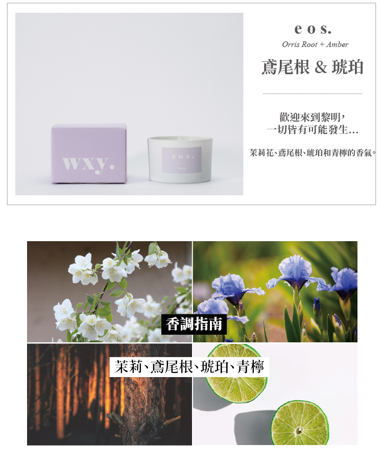 品名:wxy 經典蠟燭 (S)- eos. 鳶尾根 & 琥珀